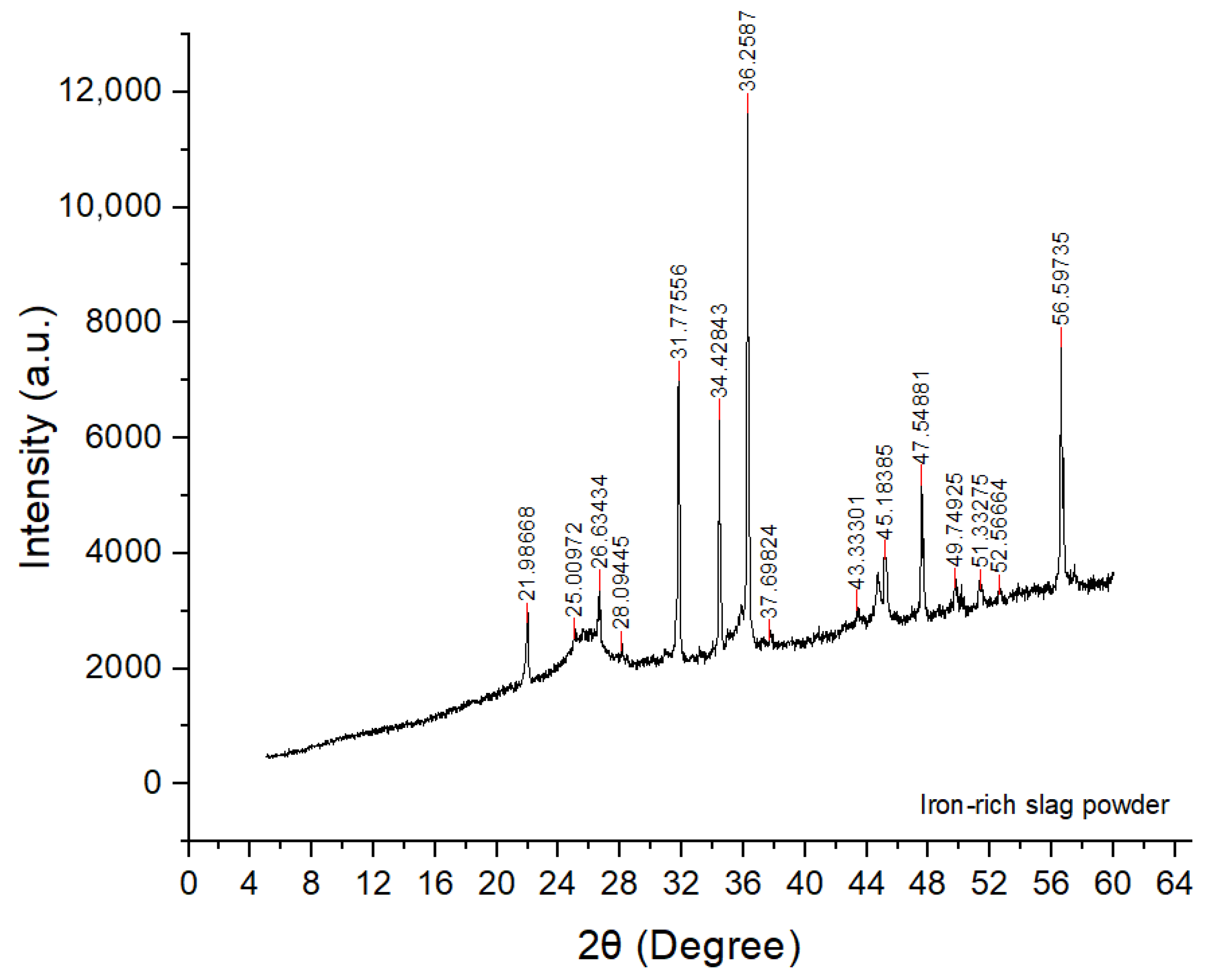 | Chemical Component | BFS (wt.%) | Iron-Rich Slag (wt.%) |