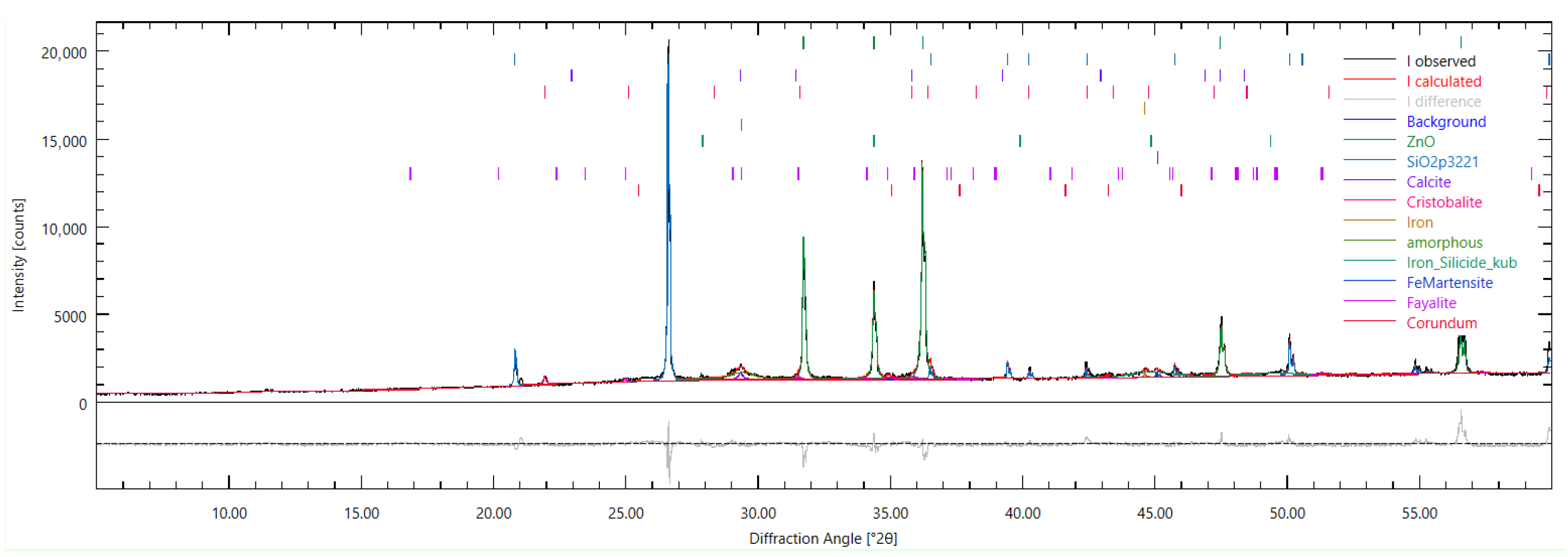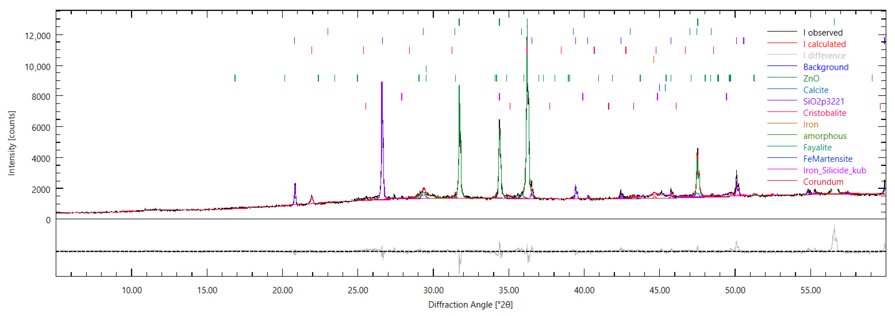Powder XRD pattern of Aachen GP at 7 days (Bragg–Brentano, –, Cu K, Å; 5–60° ). Black = measured intensity; red = calculated pattern after Rietveld refinement (Profex/BGMN); fitted background is shown; the lower trace is the difference (observed−calculated); colored ticks mark Bragg positions of the refined phases. A broad hump between ∼20–36° indicates the amorphous alkali-activated gel. Low-intensity reflections assigned by the refinement include calcite (∼29.4°), cristobalite (∼21.9°), quartz (∼26.6°), and fayalite (e.g., ∼25.0° with supporting peaks at 51–53°). Corundum (-Al2O3) is present at low intensity (e.g., ∼25.6°, 52.6°). ZnO internal-standard peaks are visible at ∼31.8°, 34.4°, 36.3°, 47.5°, and 56.6°.