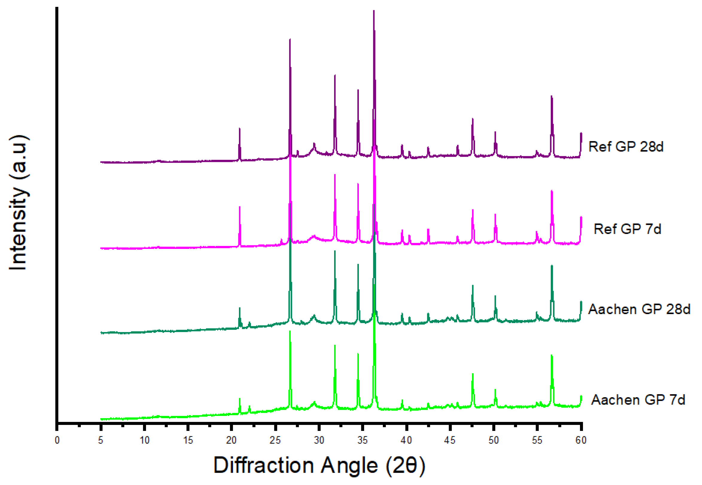 | Ref GP | 7 d | 78 | 22 | Quartz, Calcite, Cristobalite |