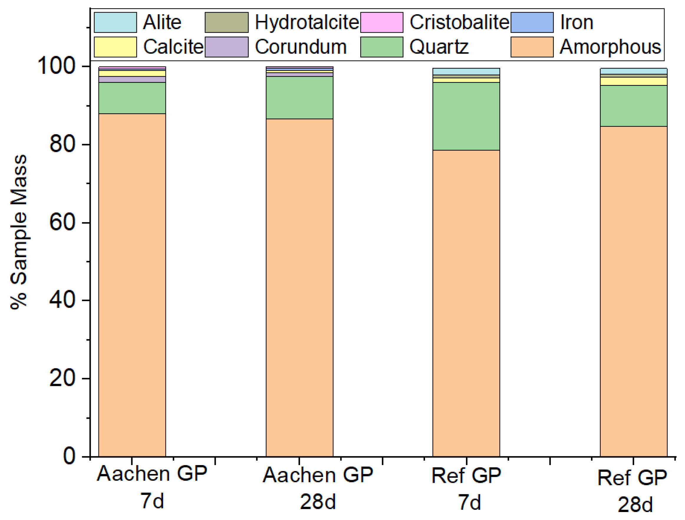 Quantitative phase composition of Ref GP and Aachen GP at 7 and 28 days derived from Rietveld refinement. The amorphous fraction dominates in all samples (>75%), while crystalline phases such as quartz, calcite, cristobalite, and minor corundum persist as residual components. Aachen GP exhibits a slightly higher amorphous fraction but comparable crystalline residues across curing ages, confirming limited phase transformation in the Fe-rich system.