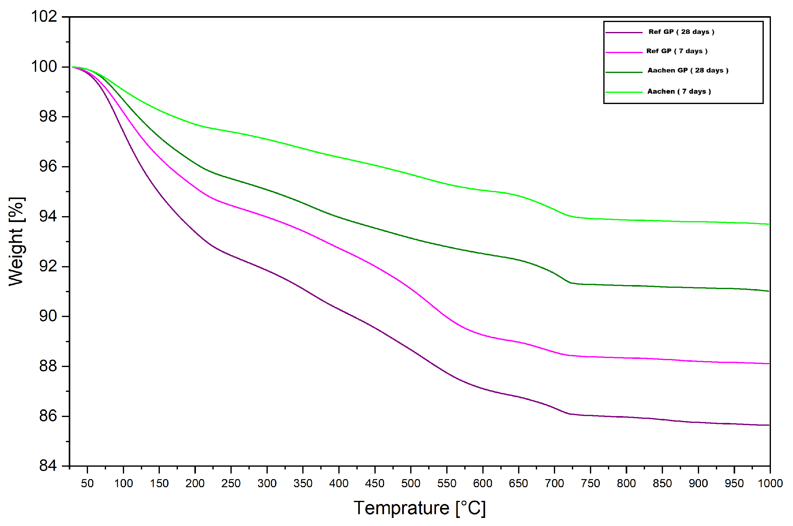 TGA curves of Ref GP and Aachen GP at 7 and 28 days. The TGA curves illustrate the total weight loss as a function of temperature, corresponding to the release of physically adsorbed water, bound water from gel phases, and decomposition of minor crystalline phases.