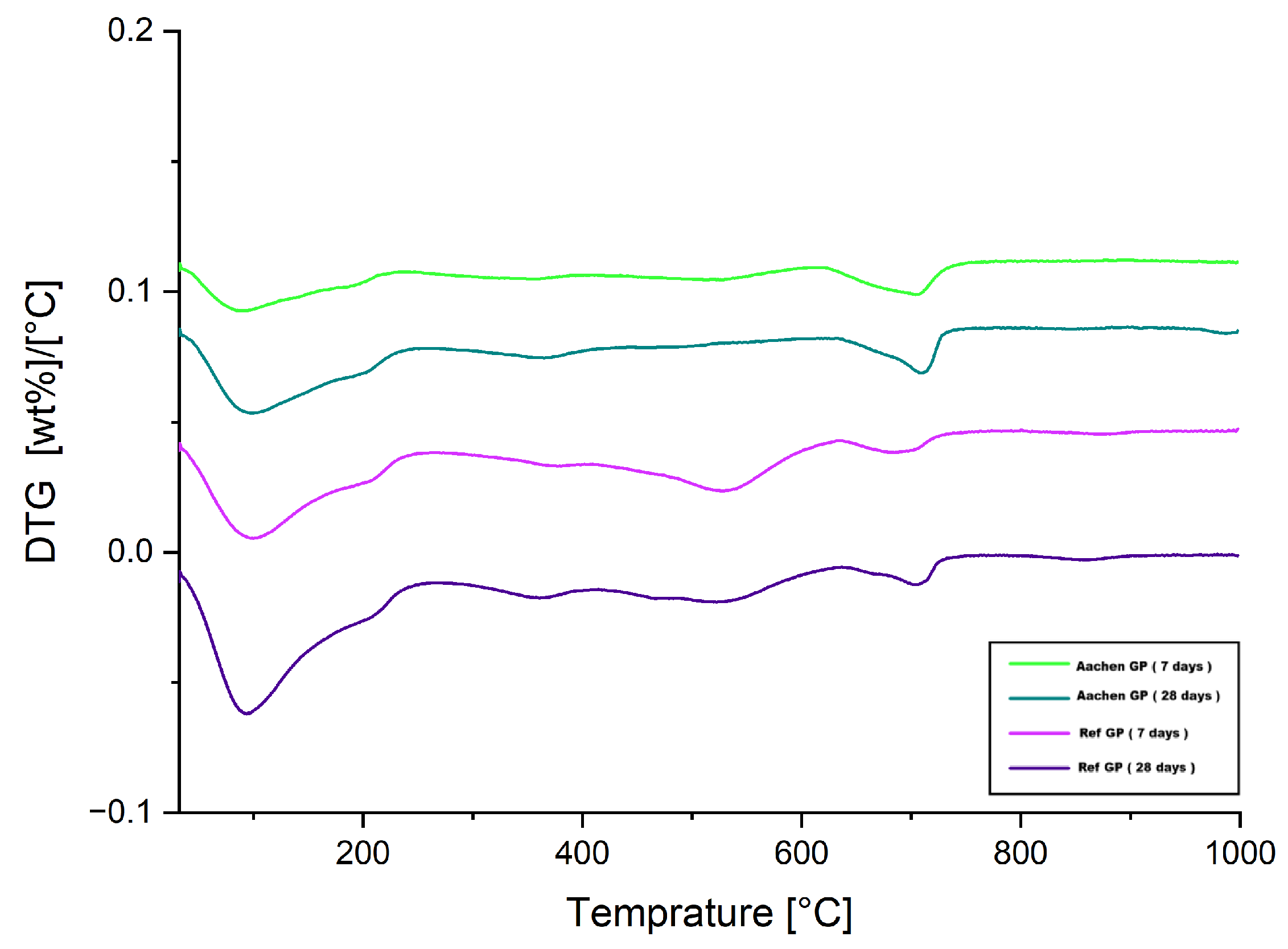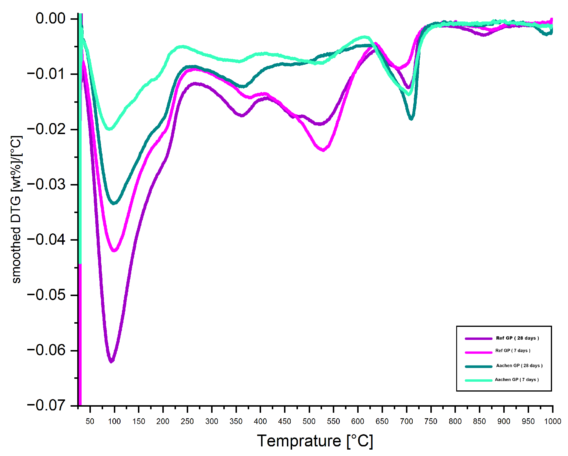 DTG curves of Ref GP and Aachen GP at 7 and 28 days, vertically shifted to aid visualization.