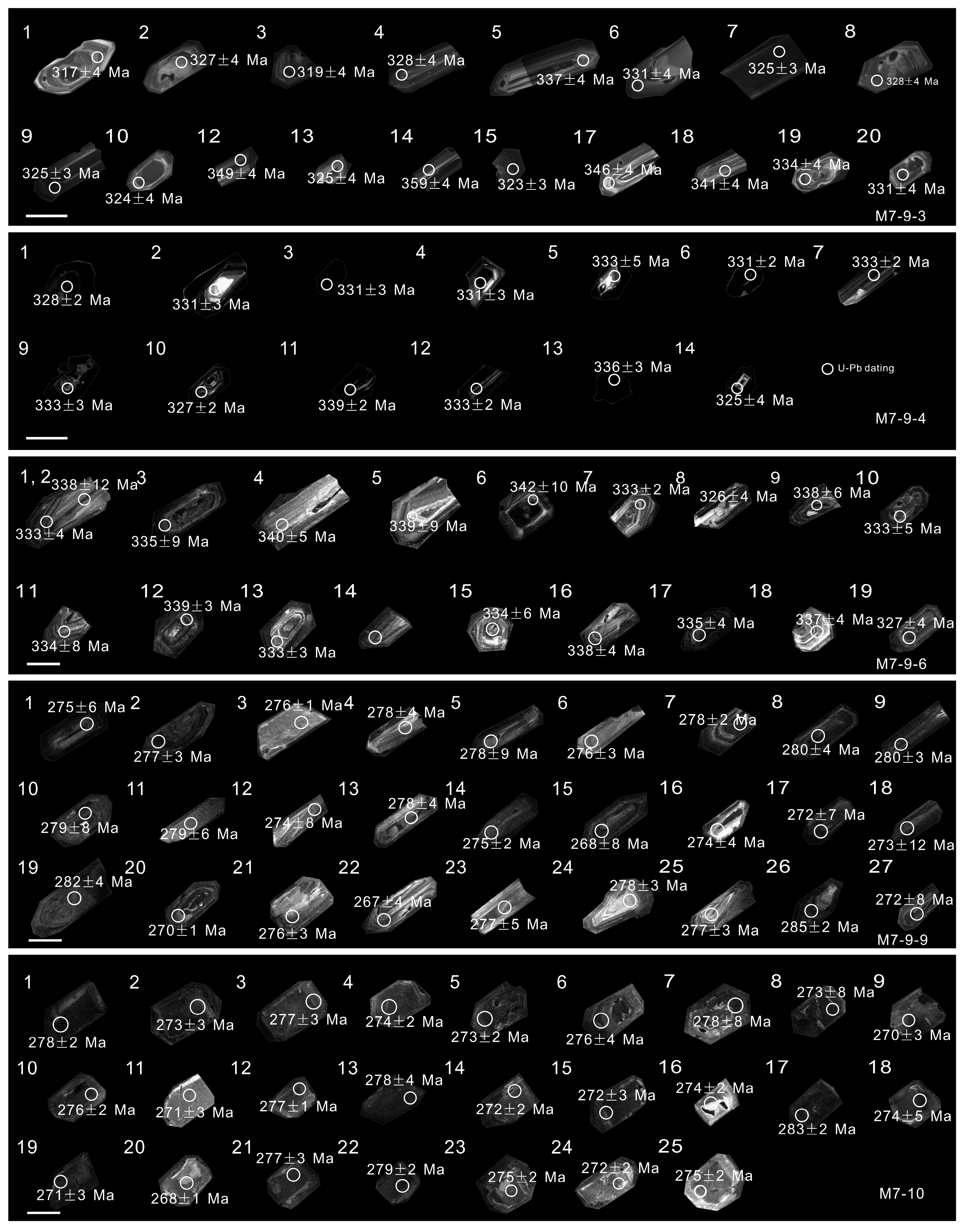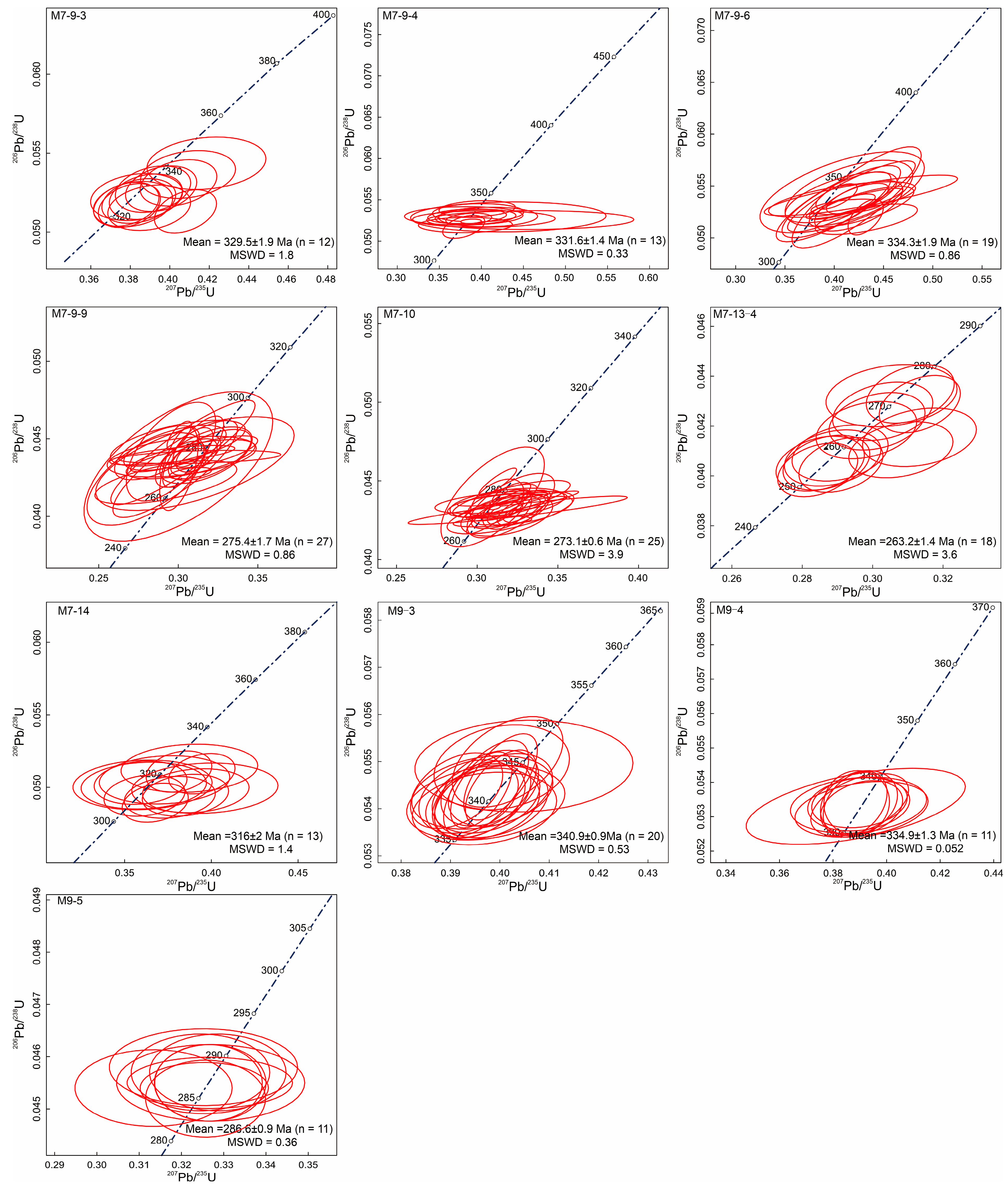 Sample (M7-9-3) yielded 206Pb/238U ages ranging from 317 ± 4 Ma to 359 ± 4 Ma, with a weighted mean age of 329.5 ± 1.9 Ma (after excluding grains #1, #3, #11, #12, #14, #16, #17, and #18, MSWD = 1.8, n = 12, 95% conf.). The Th/U ratios range from 0.85 to 2.94. Sample (M7-9-4) yielded 206Pb/238U ages ranging from 325.2 ± 3.6 Ma to 338.5 ± 2.4 Ma, with a weighted mean age of 331.6 ± 1.4 Ma (after excluding grain #8, MSWD = 0.33, n = 13, 95% conf.). The Th/U ratios range from 0.31 to 1.41. Sample (M7-9-6) yielded 206Pb/238U ages ranging from 326 ± 4 Ma to 342 ± 10 Ma, with a weighted mean age of 334.3 ± 1.9 Ma (MSWD = 0.86, n = 19, 95% conf.). The Th/U ratios range from 0.40 to 0.90. Sample (M7-9-9) yielded 206Pb/238U ages ranging from 267 ± 4 Ma to 285 ± 2 Ma, with a weighted mean age of 275.4 ± 1.7 Ma (MSWD = 2.7, n = 27, 95% conf.). The Th/U ratios range from 0.11 to 0.59. Sample (M7-10) yielded 206Pb/238U ages ranging from 268 ± 1 Ma to 283 ± 2 Ma, with a weighted mean age of 273.1 ± 0.6 Ma (after excluding grain #26, MSWD = 3.9, n = 25, 95% conf.). The Th/U ratios range from 0.45 to 0.66. Sample (M7-13-4) yielded 206Pb/238U ages ranging from 240 ± 3 Ma to 273 ± 3 Ma, with a weighted mean age of 263.2 ± 1.4 Ma (after excluding grains #9, #10, #15, #17, and #20, MSWD = 3.4, n = 15, 95% conf.). The Th/U ratios range from 0.40 to 0.85. Sample (M7-14) yielded 206Pb/238U ages ranging from 296 ± 3 Ma to 335 ± 4 Ma, with a weighted mean age of 316 ± 2 Ma (after excluding grains #1, #2, #3, #15, and #17, MSWD = 1.4, n = 13, 95% conf.). The Th/U ratios range from 0.25 to 1.05. Sample (M9-3) yielded 206Pb/238U ages ranging from 339 ± 2 Ma to 345 ± 2 Ma, with a weighted mean age of 340.9 ± 0.9 Ma (after excluding grain #21, MSWD = 0.53, n = 20, 95% conf.). The Th/U ratios range from 0.32 to 0.77. Sample (M9-4) yielded 206Pb/238U ages ranging from 334 ± 2 Ma to 335 ± 2 Ma, with a weighted mean age of 334.9 ± 1.3 Ma (after excluding grains #2, 4, 6, 7, 8, 10, 12, 13, 15, 16, and 19, MSWD = 0.052, n = 11, 95% conf.). The Th/U ratios range from 0.55 to 0.77. Sample (M9-5) yielded 206Pb/238U ages ranging from 285 ± 2 Ma to 288 ± 2 Ma, with a weighted mean age of 286.6 ± 0.9 Ma (after excluding grains #3, 4, 5, 6, 8, 10, 11, 12, 13, 16, and 22, MSWD = 0.36, n = 11, 95% conf.). The Th/U ratios range from 0.84 to 1.18.