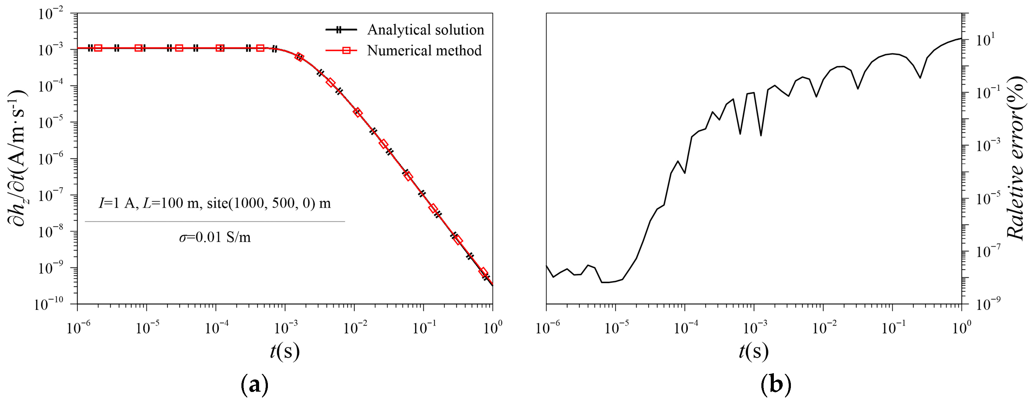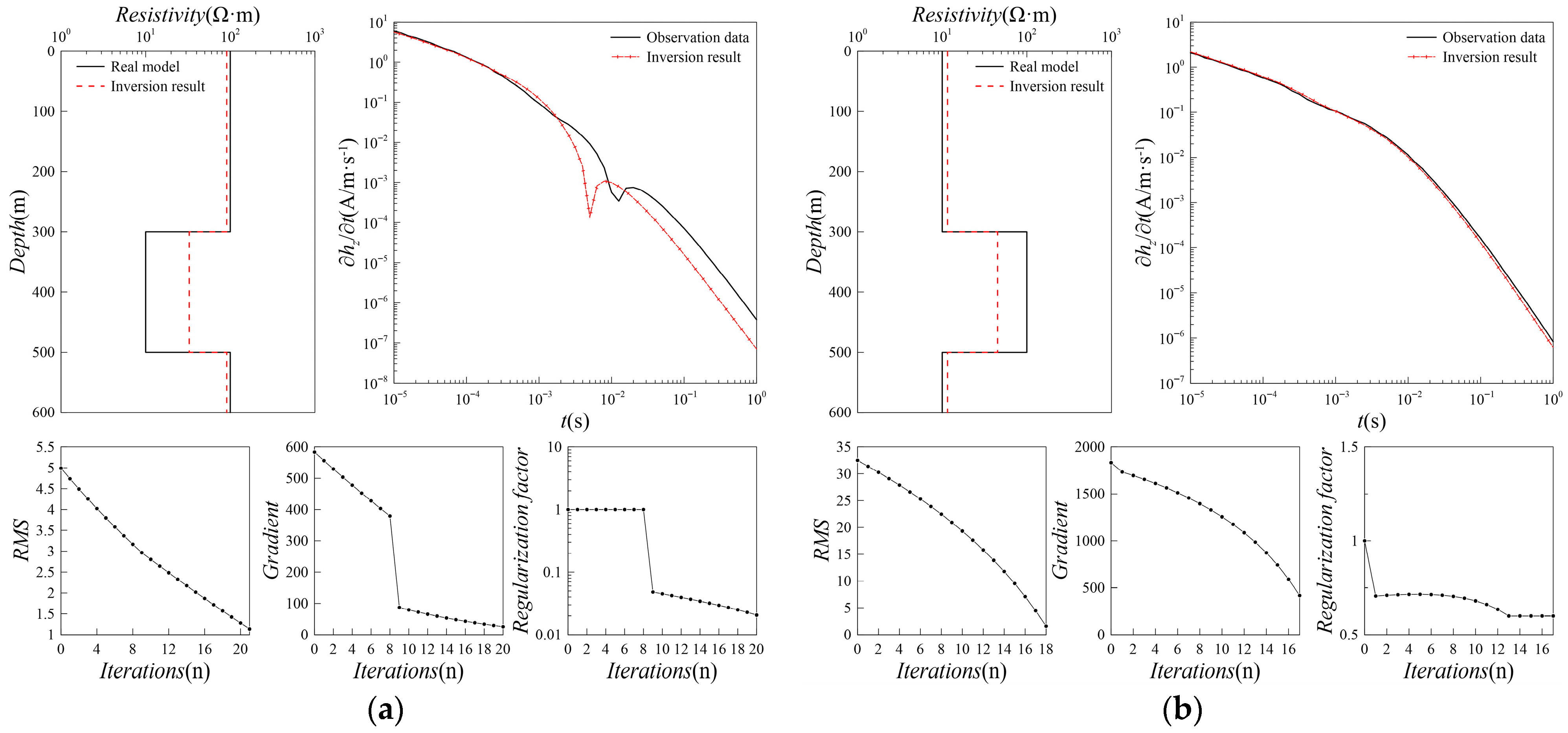 - Jin, Y. Long Wire Source Transient Electromagnetic Constrained Inversion. Master’s Thesis, University of Electronic Science and Technology of China, Chengdu, China, 2019. [Google Scholar]