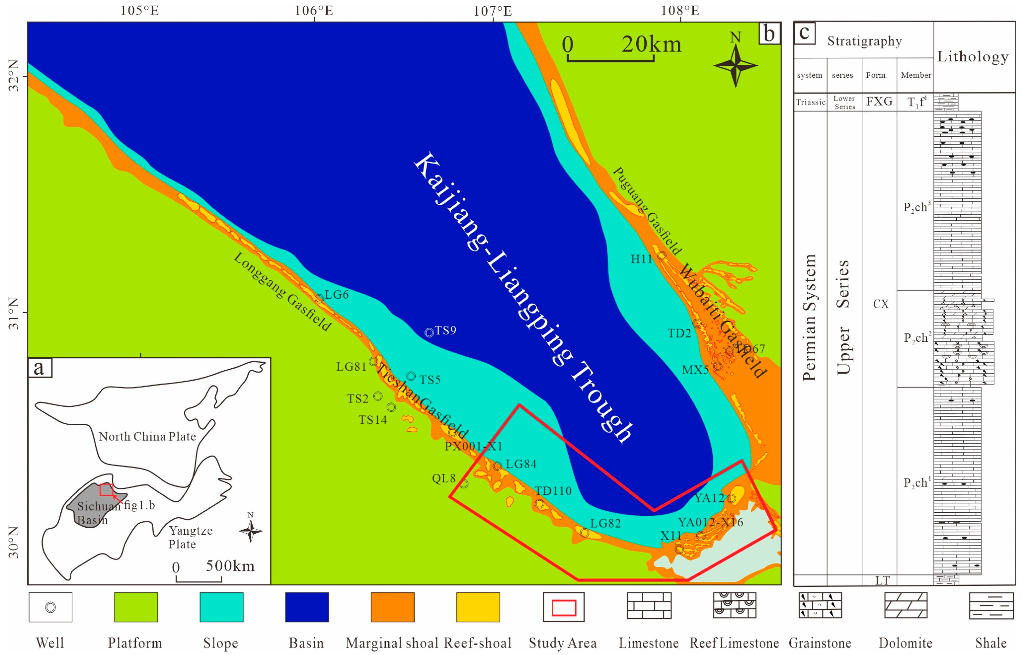 - Dong, Q.M.; Hu, Z.G.; Chen, S.Y.; Yuan, B.G.; Dai, X. Reef–shoal combinations and reservoir characteristics of the Changxing–Feixianguan Formation in the eastern Kaijiang–Liangping trough, Sichuan Basin, China. Carbonates Evaporites 2021, 36, 00698-6. [Google Scholar]