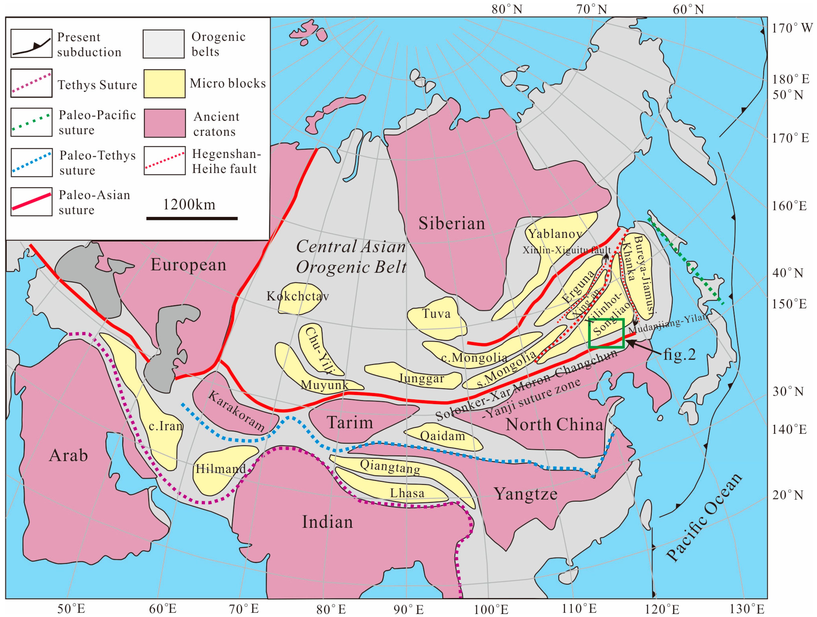 The Central Asian Orogenic Belt (CAOB), situated between the Siberian and Tarim–North China Craton [1], represents one of the world’s most extensive and complex Phanerozoic accretionary orogens. The CAOB formed through the subduction, accretion, and ultimate collision of the Paleo-Asian Ocean (PAO), and is characterized by significant crustal growth and abundant mineralization, which occurred during the Phanerozoic [1,2,3,4,5,6] (Figure 1). In northeastern China, the eastern segment of the CAOB is referred to as the Xingmeng Orogenic Belt [7,8]. This belt comprises various microcontinental blocks and accreted terranes of diverse natures and ages. From northwest to southeast, the belt can be subdivided into the Erguna Block, the Xing’an Block, the Xilinhot–Songliao Block, and the Bureya–Jiamusi–Khanka Block. These blocks successively collided along the Xinlin–Xiguitu, Heihe–Hegenshan, and Mudanjiang–Yilan suture zones [9,10,11], and were finally amalgamated with the North China Craton along the Solonker–Xar Moron–Changchun–Yanji suture zone [3,4,12,13,14] (Figure 1).
