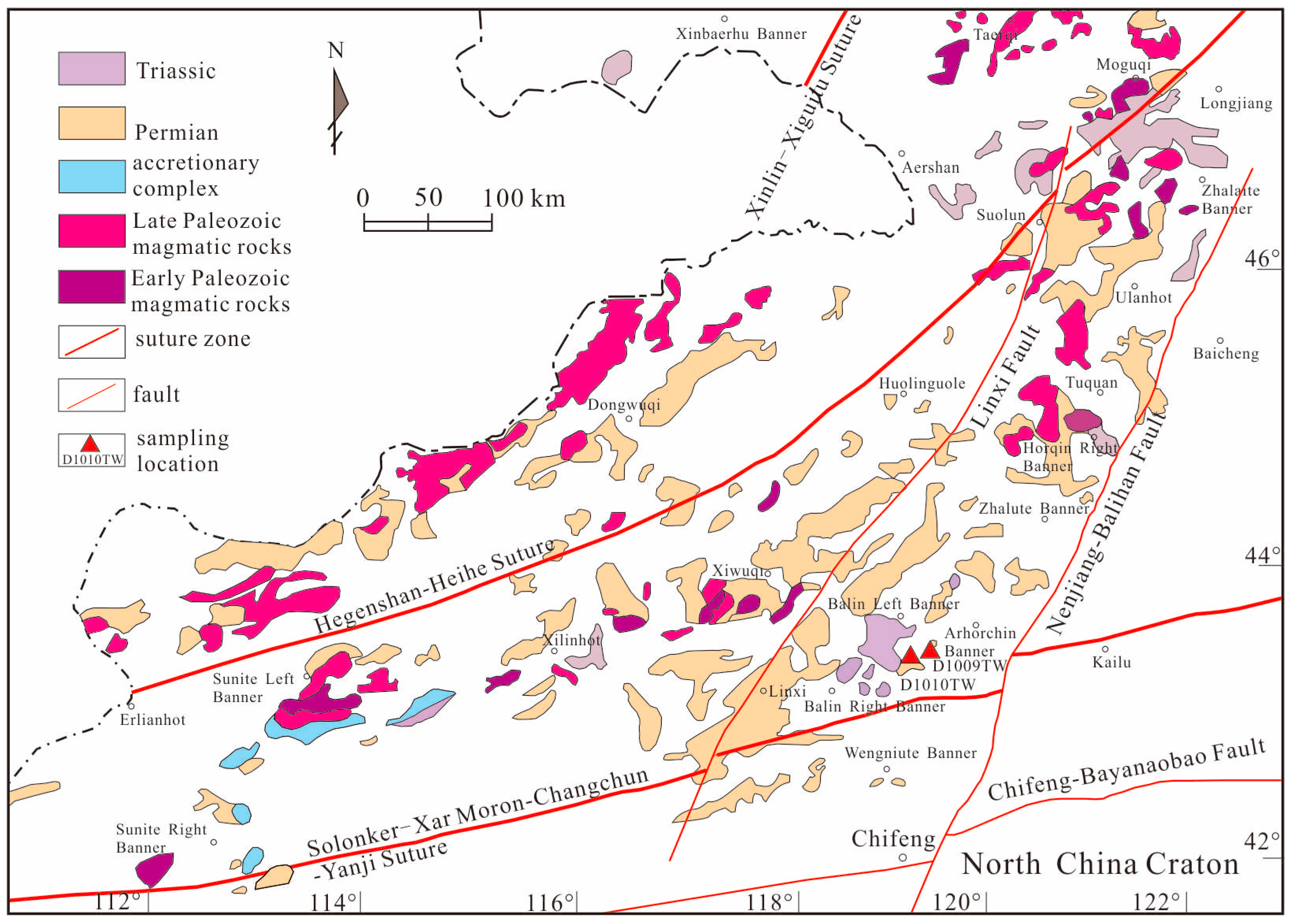 The study area exhibits magmatic activity spanning multiple periods, including the Early and Late Paleozoic, Mesozoic, and Cenozoic. Among these, Late Paleozoic to Early Mesozoic magmatism is extensively distributed in an NEE-trending orientation north of the Solonker–Xar Moron River ophiolite belt. The rock types and assemblages are complex and diverse, and are thought to be associated with the late-stage evolution of the PAO [45,49]. The focus of this study is the analysis of Early to Middle Permian magmatic rocks to investigate Late Paleozoic magmatism within the orogenic belt and the tectonic evolution of the PAO.