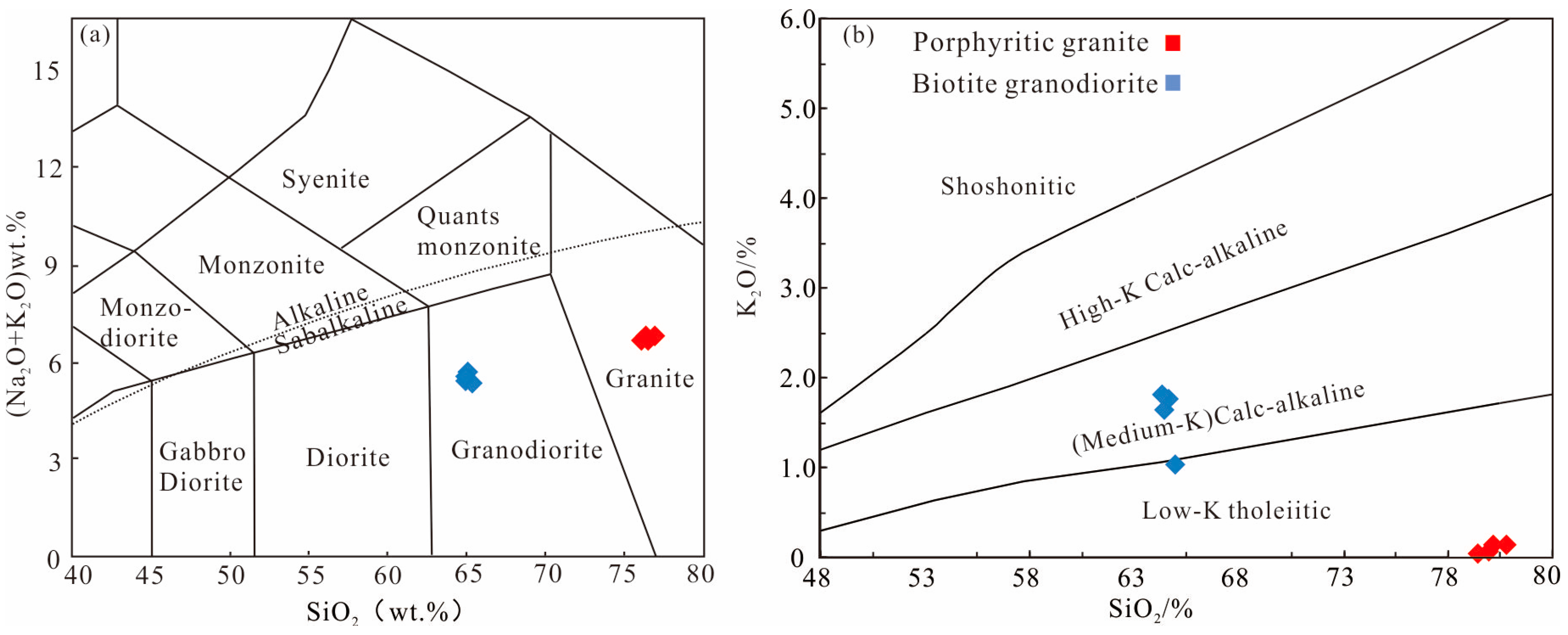 The Early Permian biotite granodiorite (sample D1010TW) has the following major oxide contents (Table 1): SiO2 = 64.2–65.0 wt%, Al2O3 = 15.6–16.2 wt%, MgO = 1.6–1.8 wt% (Mg# = 29.7–32.3, mean = 31.3), TFeO = 6.47–6.96 wt%, CaO = 4.2–4.6 wt%, Na2O = 3.6–4.2 wt%, and K2O = 1.0–1.8 wt%. The K2O/Na2O ratios ranged from 0.24 to 0.49. On the TAS classification diagram (Figure 4a), the samples fall within the granodiorite field and belong to the calc-alkaline series, and in the SiO2–K2O diagram (Figure 4b), they mainly fall within the calc-alkaline field. The aluminum saturation indices (A/CNK = 0.95–1.03; A/NK = 1.92–2.07) indicate metaluminous to weakly peraluminous characteristics.
