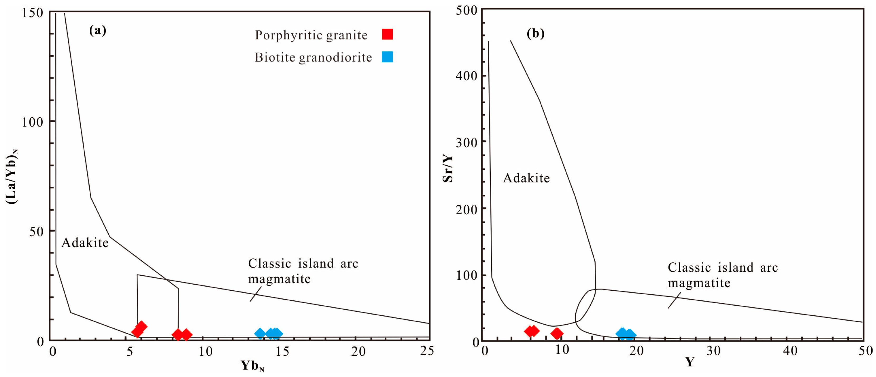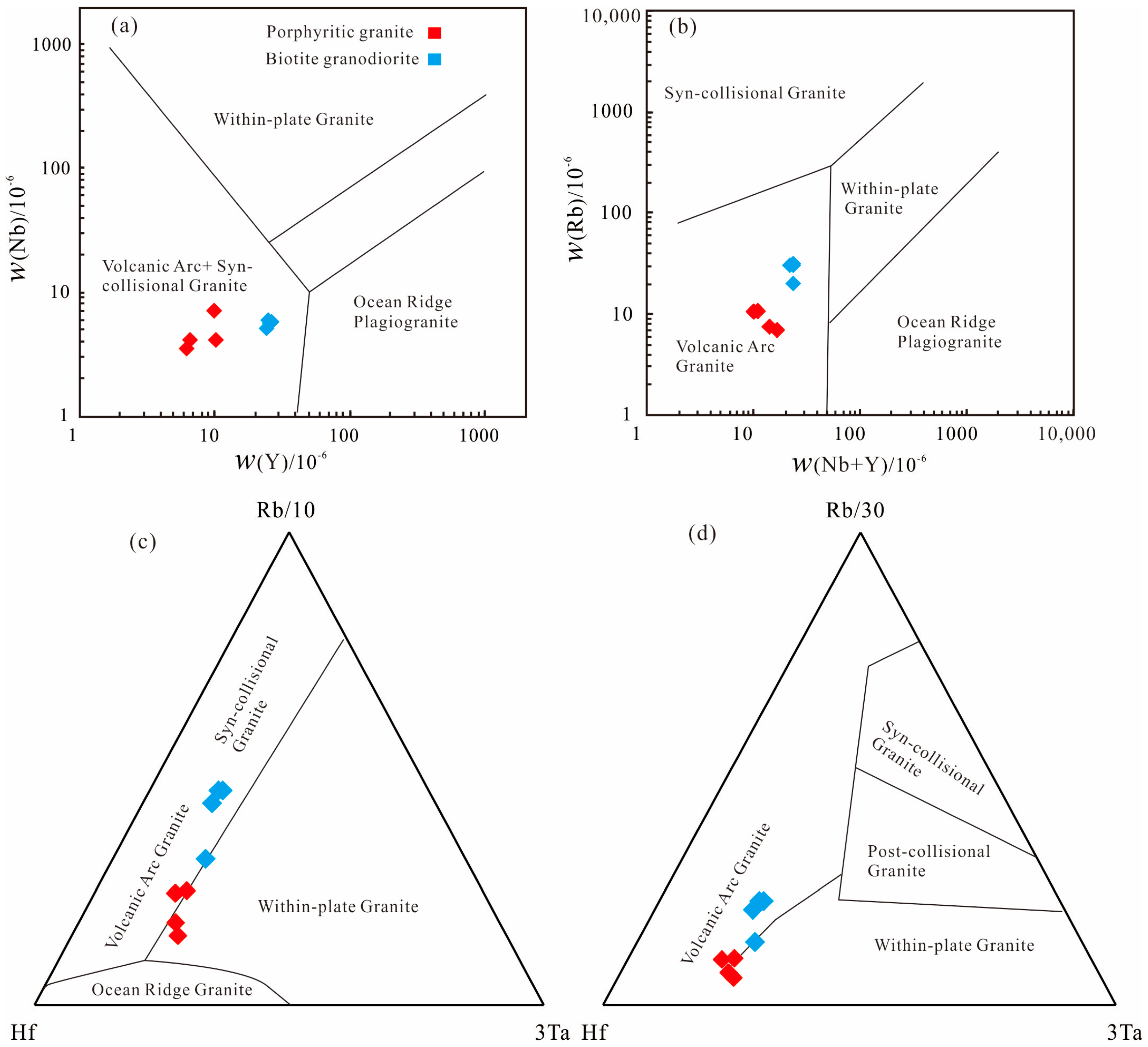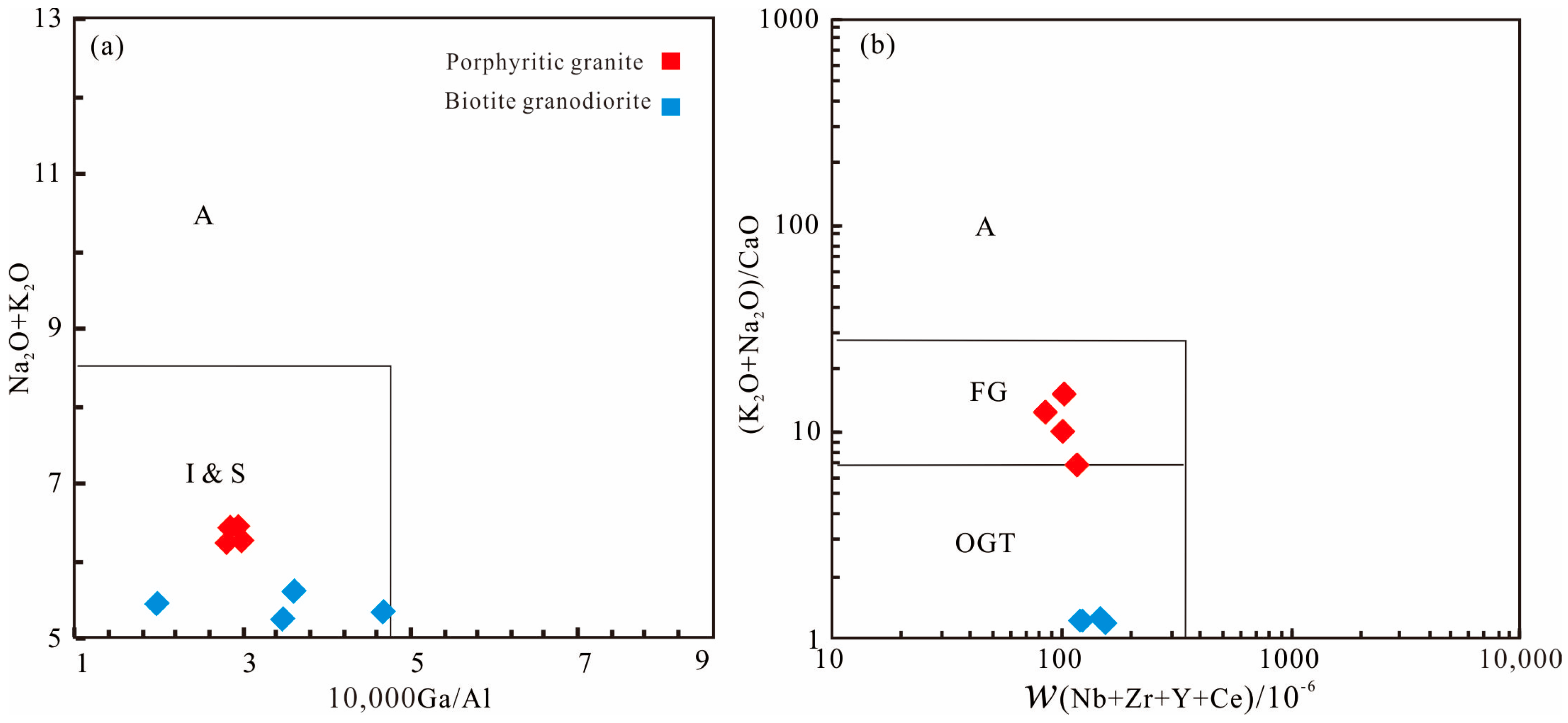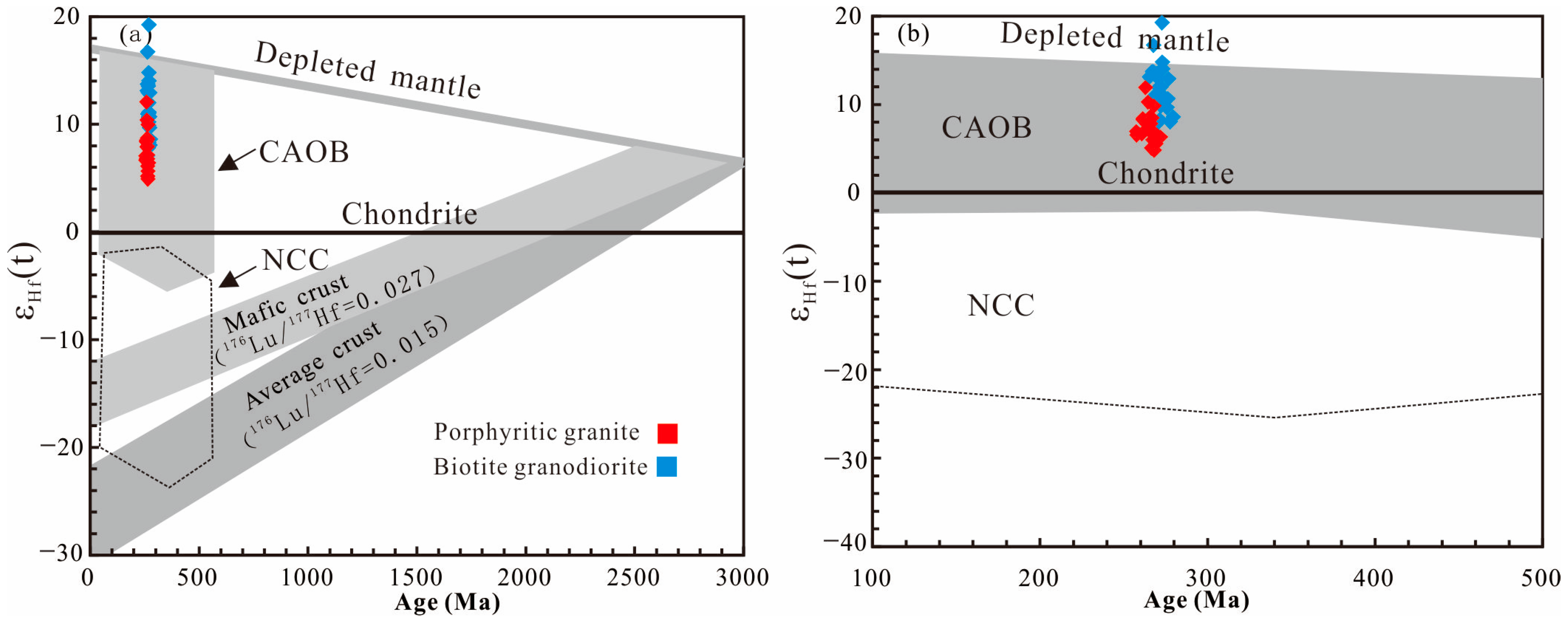 Two samples were selected for U–Pb isotopic and Lu-Hf isotopic analyses, respectively, and eight samples were selected for whole-rock geochemical analysis. Early Permian biotite granodiorite and Middle Permian porphyritic granite samples were used for geochronology and geochemistry.
