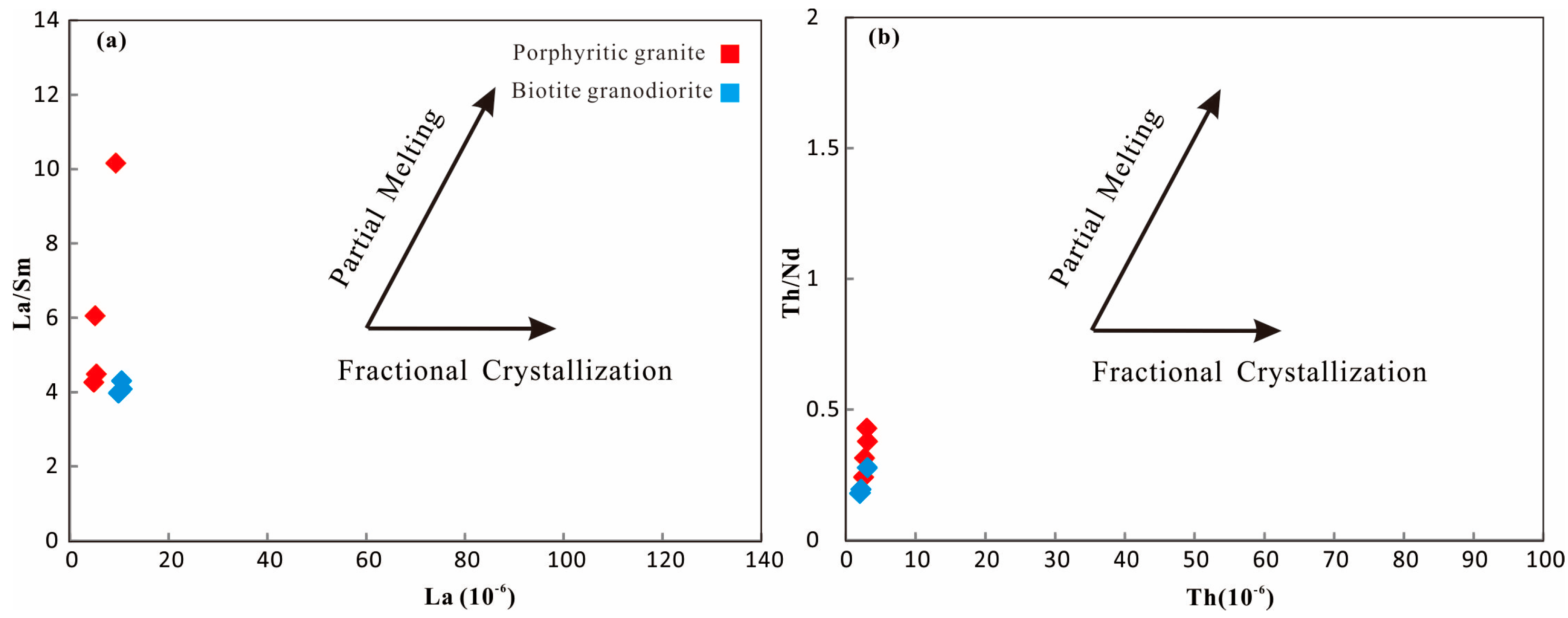 The biotite granodiorite (sample D1010TW) has a total rare earth element (REE) content ranging from 60.0 to 62.8 ppm, with the concentrations of light rare earth elements (LREE) ranging from 47.9 to 50.1 ppm and those of heavy rare earth elements (HREE) varying between 12.1 and 12.7 ppm. The rocks are characterized by enrichment of light REEs (LREEs) and relative depletion of heavy REEs (HREEs). The (LREE/HREE) ratio varies from 3.84 to 3.97 (mean = 3.91), and (La/Yb)N values range from 2.96 to 3.19 (mean = 3.09; Table 1). The sample exhibits a weak negative Eu anomaly (δEu = 0.80–0.86) and a slight negative Ce anomaly (δCe = 0.91–0.94; Figure 5a). On the primitive mantle-normalized trace element diagram (Figure 5b), the samples exhibit enrichment in large ion lithophile elements (LILEs; e.g., Rb, Ba, and K) and depletion in high field strength elements (HFSEs; such as Nb, Ta, Ti, and P). They also show low Sr contents (204.0–245.8 ppm), and relatively high Y (18.3–19.5 ppm) and Yb (2.34–2.53 ppm) concentrations. The porphyritic granite (sample D1009TW) shows a total rare earth element (REE) content ranging from 29.15 to 42.36 ppm. The samples contained LREEs with concentrations ranging from 22.9 to 38.0 ppm and HREEs from 4.3 to 6.4 ppm. The chondrite-normalized REE pattern is characterized by light REEs enrichment (LREEs), relative depletion in heavy REEs (HREEs), and a weakly fractionated LREE/HREE ratio ranging from 3.67 to 8.01 (mean = 5.53). The (La/Yb)N values vary between 2.42 and 6.46 (mean = 3.78; Table 1), indicating a right-inclined LREE pattern and a relatively flat HREE distribution. The sample exhibits a weak negative Eu anomaly (δEu = 0.70–1.00) and no significant Ce anomaly (δCe = 0.94–1.09; Figure 5a). In the primitive mantle-normalized trace element spider diagram (Figure 5b), the rock is enriched in large ion lithophile elements (LILEs; e.g., Rb, Ba) and depleted in high field strength elements (HFSEs; e.g., Nb, Ta, Ti, P). It also exhibits low concentrations of Sr (84.0–90.0 ppm), Yb (1.00–1.53 ppm), and Y (6.5–10.0 ppm).