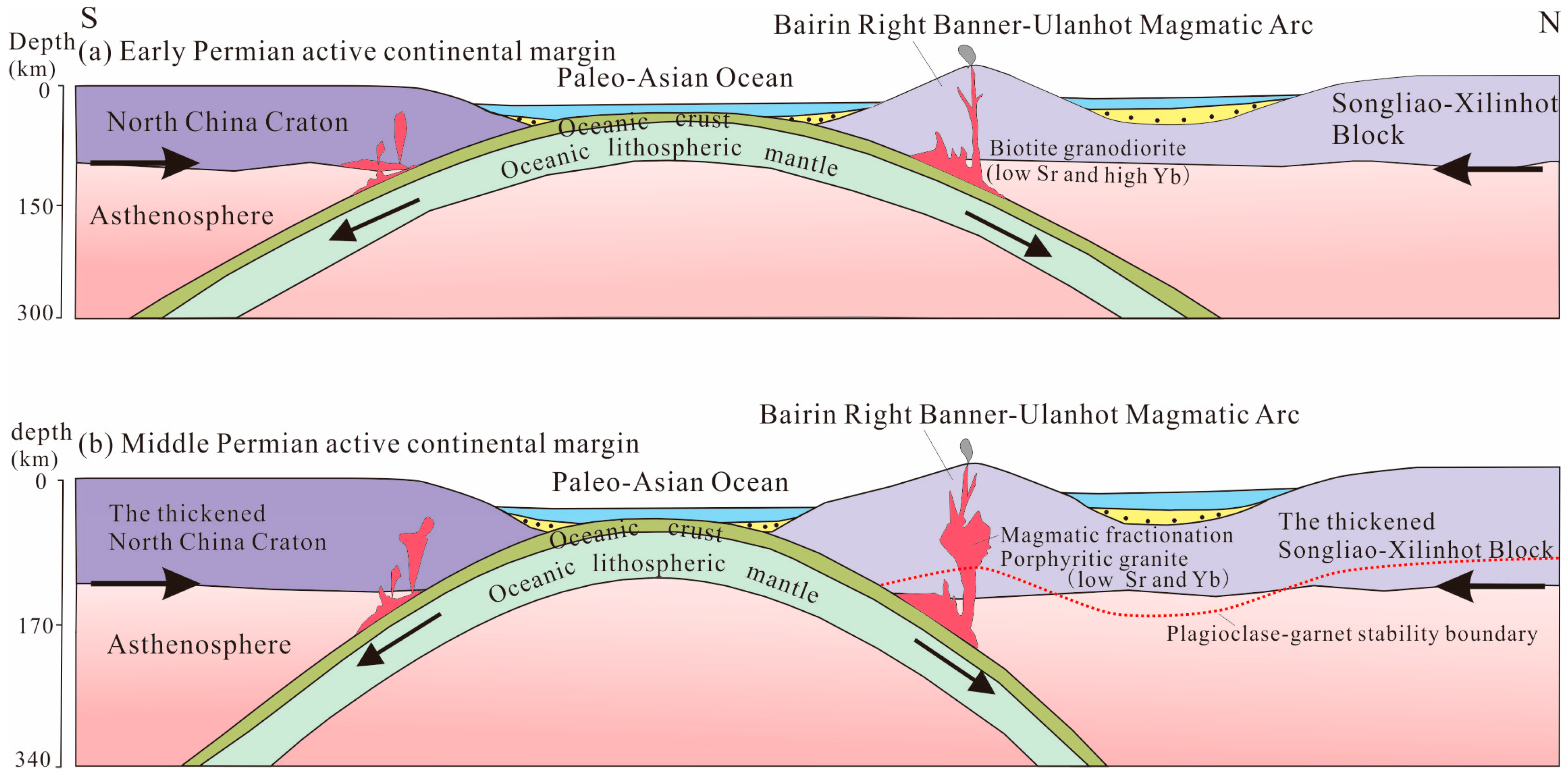 The tectonic evolution of the Paleo-Asian Ocean during the Early to Middle Permian remains a key issue in understanding the geodynamic history of the Central Asian Orogenic Belt. To address this, we conducted petrological, whole-rock geochemical, zircon U–Pb geochronological, and Hf isotopic analyses of Early Permian biotite granodiorite and Middle Permian porphyritic granite from the south-central Great Xing’an Range. Zircon U–Pb dating yields ages of 273.2 ± 1.4 Ma and 264.4 ± 1.5 Ma, indicating that these intrusions emplaced during Early and Middle Permian. Geochemical analyses show that the rocks are characterized by high SiO2 and Al2O3 contents, and low MgO and CaO contents and belong to the metaluminous to weakly peraluminous series, typical of I-type granites. The rocks are enriched in light rare earth elements and large-ion lithophile elements (e.g., Rb, Ba, K), but depleted in heavy rare earth elements and high field strength elements (e.g., Nb, Ta, P, Ti), with weakly negative Eu anomalies. The Early Permian pluton exhibits low-Sr and high-Yb characteristics and thus fall in the plagioclase stability field. In contrast, Middle Permian pluton was derived from magmas generated by partial melting under high-pressure conditions and that, underwent crystal fractionation during ascent to the mid-upper crust, ultimately forming low-Sr and low-Yb type granites. All zircon εHf(t) values are positive (+4.84 to +14.87), with the corresponding two-stage Hf model ages ranging from 345 Ma to 980 Ma, indicating that the magmas were predominantly derived from juvenile crustal materials accreted during the Neoproterozoic to Phanerozoic. Considering these results, we propose that the Paleo-Asian Oceanic plate continued to subduct beneath the Songliao–Xilinhot block to the north during the Early to Middle Permian, with intense subduction and crustal thickening occurring in the Middle Permian. This suggests that the south-central segment of the Great Xing’an Range was situated in an active continental marginal setting during the Early-Middle Permian.