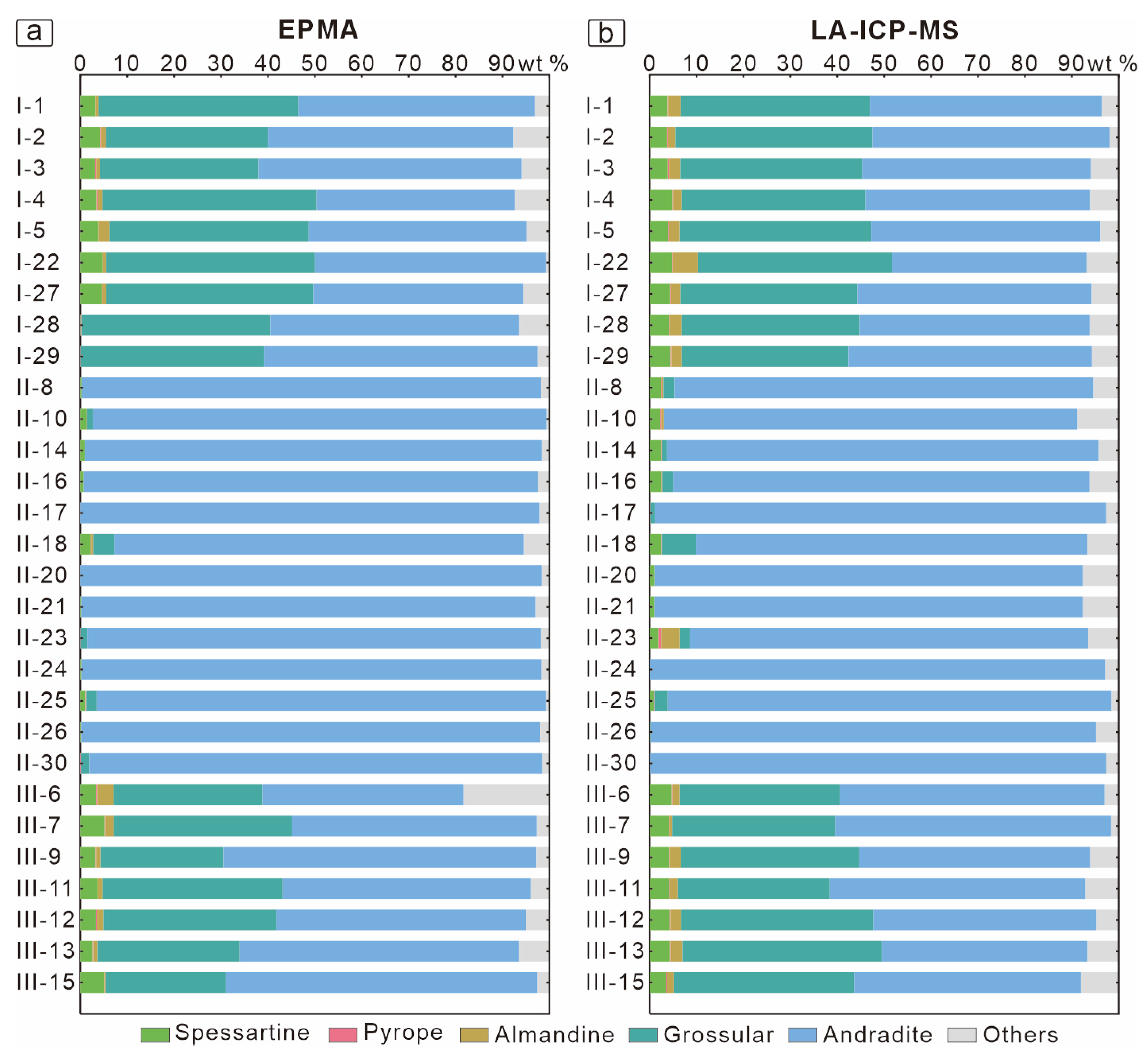 | Grt II | And83–97Gro0–7Alm0–4Spe0–3 | Lower | High | Weakly acidic | Strong | High Cl; Increase in Co, Ni, and Cu Contents |