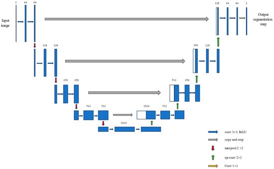 The U-Net architecture, proposed by Ronneberger et al. in 2015 [12], was originally designed for biomedical image segmentation. The architectural structure of the model is illustrated in Figure 1. The key advantage of the model lies in its encoder–decoder structure, enhanced by employing the skip connections, which effectively combine semantic and spatial information [12].