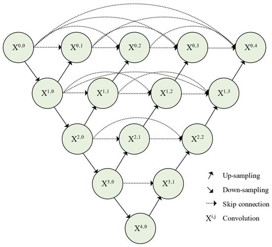 To overcome the feature inconsistency issue of the original U-Net, Zhou et al. (2018) proposed the Nested U-Net, also known as U-Net++ [19]. As shown in Figure 2, this model introduces a densely nested skip-connection structure, forming a pyramid-like multi-scale fusion pathway that enables fine-grained feature integration across different depths.