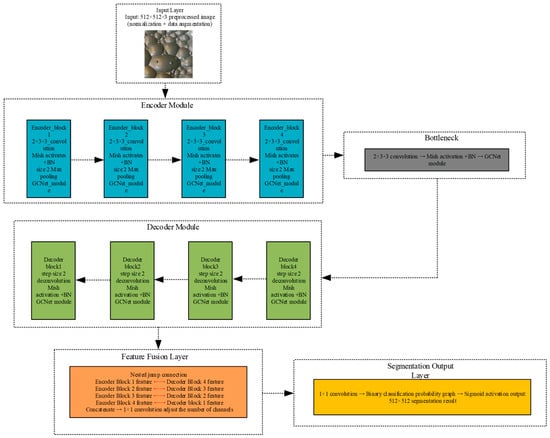 The overall structure of GC-FSegNet is shown in Figure 3. The model follows a modular encoder–decoder architecture comprising six main components: an input layer, encoder, bottleneck, decoder, feature fusion module, and segmentation output layer.