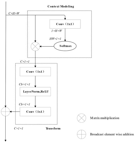 The GCNet, proposed by Cao et al. [25], is designed to efficiently capture long-range dependencies while maintaining computational simplicity, making it ideal for industrial segmentation tasks. As illustrated in Figure 4, GCNet consists of two core components: Context Modeling and Feature Transformation.