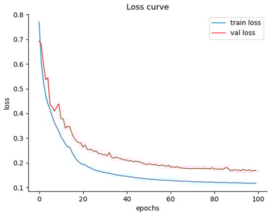 This loss curve plots training epochs on the horizontal axis and loss values on the vertical axis, where the blue curve represents training loss and the red curve represents validation loss. The trend reveals that both curves exhibit a rapid decline during the initial training phase, as the model swiftly learns fundamental features of flotation bubbles—such as bubble shape and grayscale distribution. As training progresses, the loss curves gradually stabilize, with the training loss settling around 0.12 and the validation loss stabilizing near 0.18.