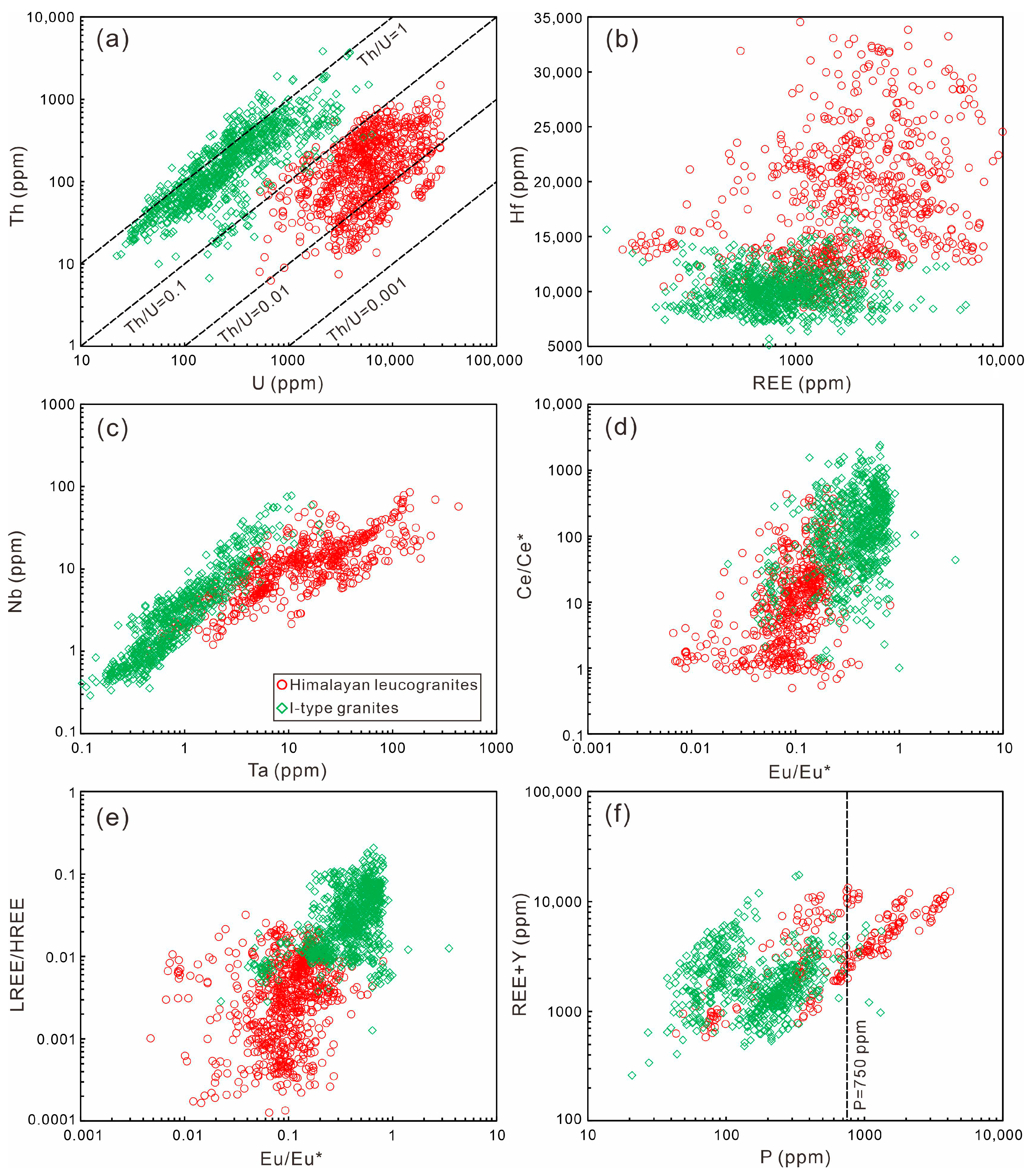 - Zircons from Himalayan leucogranites exhibit higher U, Hf, Nb, Ta contents and U/Yb ratios, but lower Eu/Eu*, Ce/Ce*, LREE/HREE, Th/U, and Ce/U ratios than those from I-type granites.
