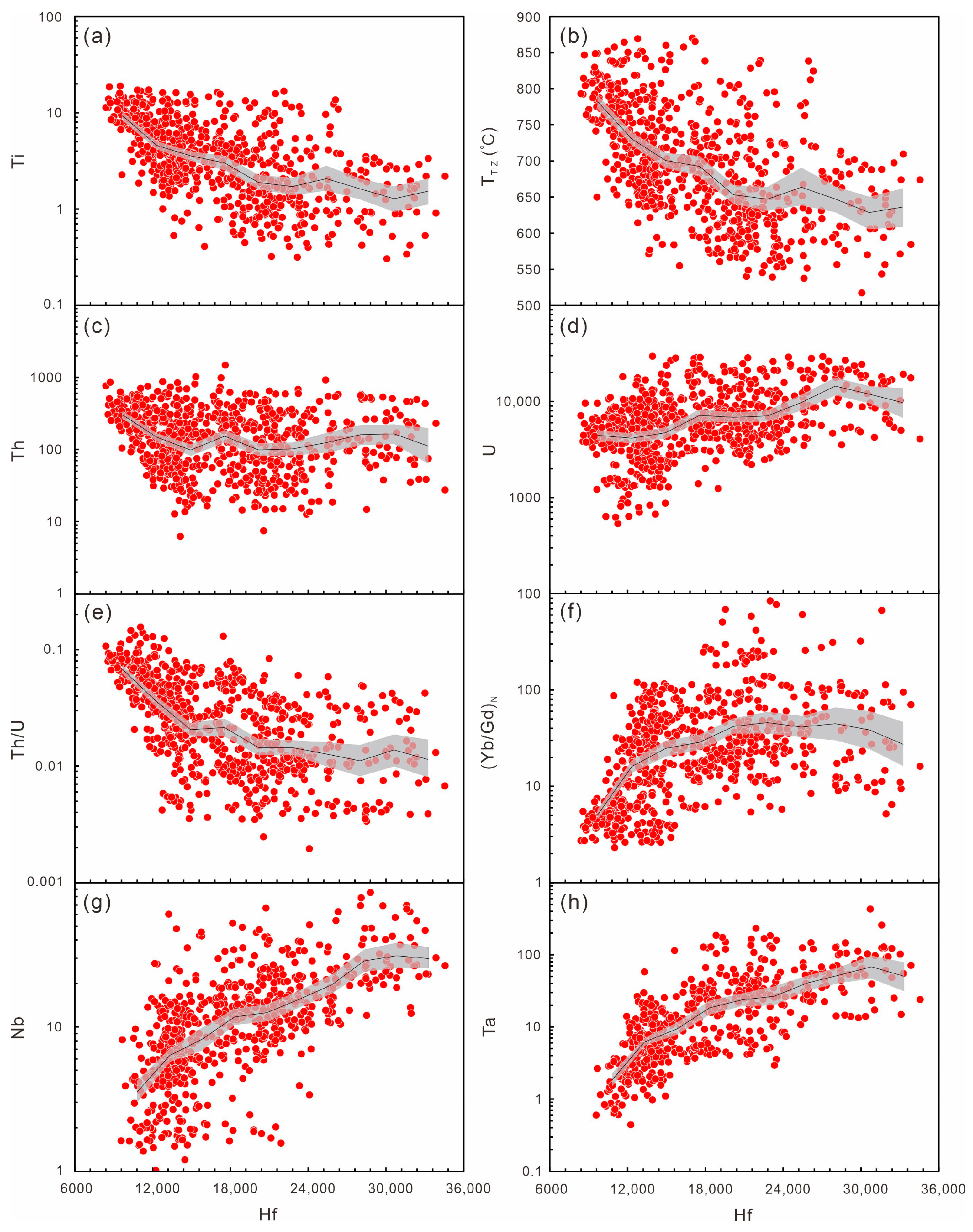 - Claiborne, L.L.; Miller, C.F.; Walker, B.A.; Wooden, J.L.; Mazdab, F.K.; Bea, F. Tracking magmatic processes through Zr/Hf ratios in rocks and Hf and Ti zoning in zircons: An example from the Spirit Mountain batholith, Nevada. Mineral. Mag. 2006, 70, 517–543. [Google Scholar] [CrossRef]