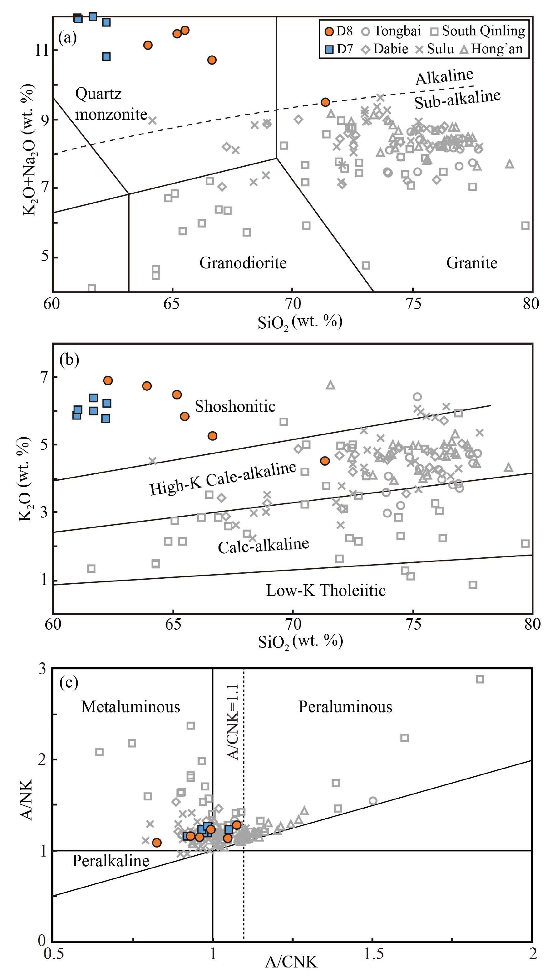 - Chen, C.; She, Z.B.; Ma, C.Q.; Yuan, J.L.; Kong, L.Y.; Wang, D.; Zhu, J.; Fan, C.; Guo, P.; Deng, H.; et al. Widespread ca. 800 Ma granitoids in the southern Dabie Orogen: Petrogenesis and implications for Neoproterozoic accretion-type orogeny in the northern Yangtze Block. Precambrian Res. 2024, 414, 107610. [Google Scholar] [CrossRef]