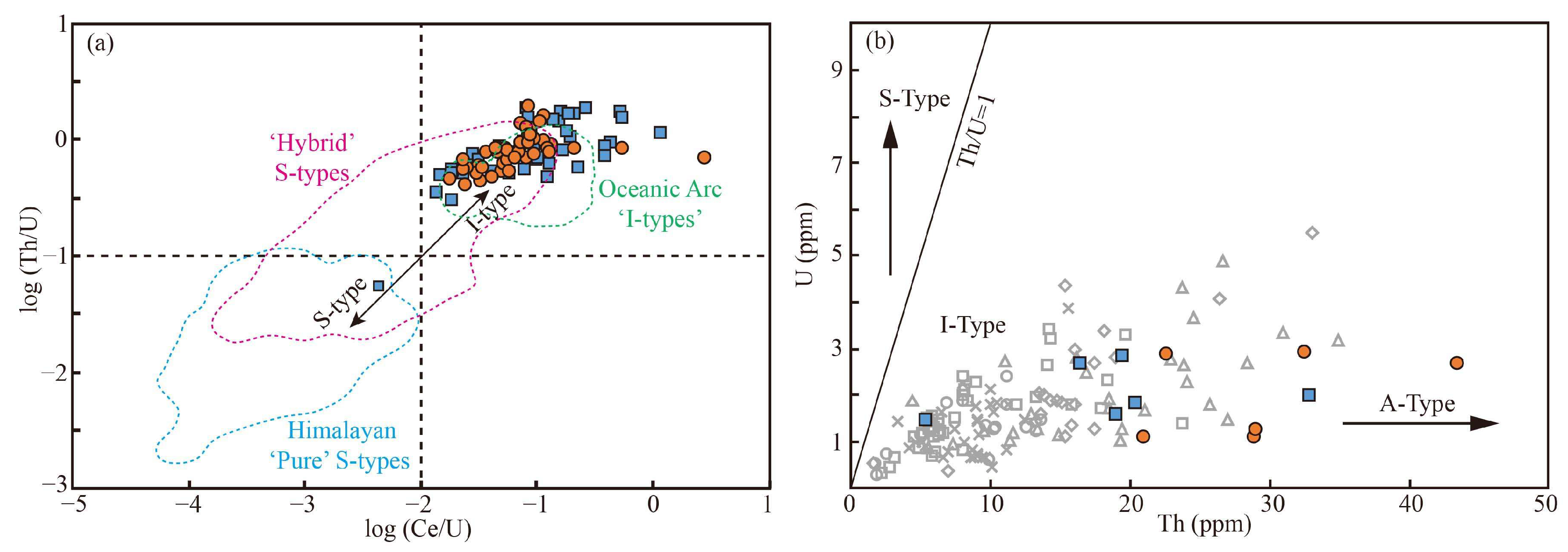- Regelous, A.; Scharfenberg, L.; De Wall, H. Origin of S-, A- and I-Type Granites: Petrogenetic Evidence from Whole Rock Th/U Ratio Variations. Minerals 2021, 11, 672. [Google Scholar] [CrossRef]