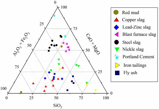 For the above five main types of backfill binders, the active Ca-Si-Al chemical compositions, which are taken from the literature and field investigation, are shown in Figure 3. The diagram can provide a basis for activity evaluation, modification methods, and utilization of potential backfill binder material. Key properties and some examples of the green mine backfill binders are listed in Table 1.