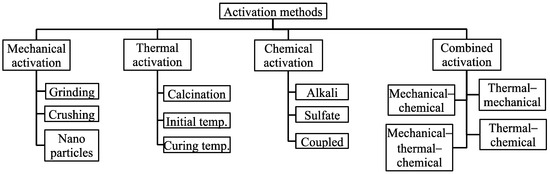 Figure 4 summarizes the current activation methods for CPB binders. Due to the differences in physicochemical properties, diverse slag types, and different application scenarios, it is difficult to determine the optimal activation scheme in practice, and combined activation experiments need to be conducted.