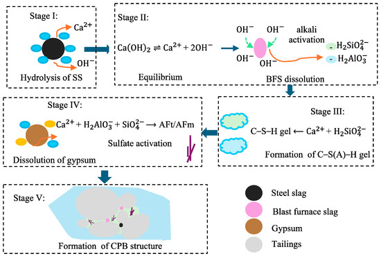 The hydration process of CPB binder materials can be divided into five stages. The first stage is the hydrolysis of the alkaline activator, forming an alkaline solution environment. The second stage is the equilibrium of precipitation dissolution of generated by and . In this stage, pozzolanic materials such as slag and fly ash are dissolved by to form and . In the third stage, reacts with and to produce a quantity of gel products such as hydrated calcium silicate and hydrated calcium aluminates. The fourth stage involves the reaction of with and to form microcrystalline AFm and AFt. The fifth stage is the gradual slag deposition and gel growth of hydration products on the surface of the particles, creating a complex structure of flocs. For example, the hydration process of the SS–BFS–gypsum binder system, modified from Hao’s study [65], is shown in Figure 5. Helinski et al. [66] proposed a model showing that the pore-water pressure change depends on the amount of volume change associated with the cement hydration, the incremental stiffness change in the soil, and the porosity of the material. The rate of hydration and volumes of water consumed during hydration were unique for each cement–tailings combination regardless of the mix proportions.