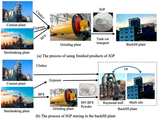 Jiaogu powder (JGP), also known as BFS-based backfill binder material, is currently the most widely used binder material after Portland cement in China’s metal mines. It usually comprises 70 wt.% BFS powder and 30 wt.% activator (clinker and gypsum), and it has achieved significant results in commercial applications. China’s JGP originated in the Shandong province in 2004, where its first production line had an annual output of 20,000 tons for underground filling at Sanxin Company (Daye, China). Under the same cement dosage (dry contents 10 wt.%) and slurry concentration (74 wt.%), the strength of the slag-CPB was more than twice that of the cement-CPB, and the slurry flowability and workability were good [52]. After years of development and improvement, the JGP utilization has been shifted from combining the “C material” (activator) shipped from Shandong with local slag mixture to localized manufacture across the country. The raw materials are widely sourced, the grinding process is simple (industrial ball mills), the production cost is low, and the binding performance is good. According to incomplete statistics, there are currently over 50 JGP manufacturers in China. There are two utilization strategies, shown in Figure 6: (1) Finished JGP products manufactured in a grinding plant and then transported in tank cars to the backfill plant users. This method is convenient to apply, but the product price is high, and the users cannot control the quality. (2) Mine users buy the three raw materials separately and then mix them using a Raymond mill or place them in multiple powder silos in the backfill plant. This method has the lowest cost but requires accurate control of the mixing ratio to avoid activation failure accidents. If a mine has an annual usage of over 10,000 tons, it is also preferable to build a grinding plant next to the backfill plant with the benefits of quality and costs being controllable. The cost savings can enable the construction investment to be recovered within 3 years.