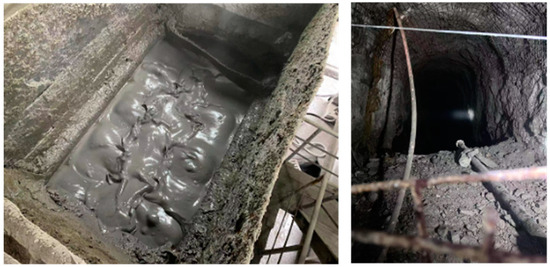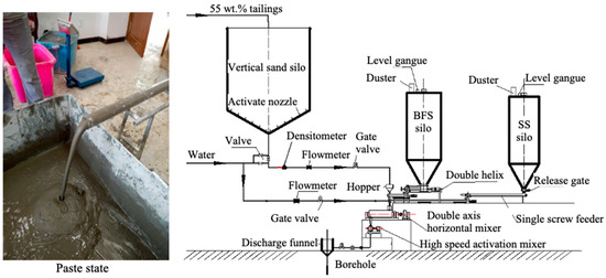 Indoor experiments have shown that the backfill binder made with BFS-SS-gypsum has good binding properties and low production costs. In 2019, steel slag Gujie powder (SSGJP) achieved its first national large-scale industrial utilization in the Zhongguan Iron Mine, Hebei province, China. The SSGJP has SS content of 40 to 45 wt.%, showing excellent binding performance for ultra-fine tailings that have –74 μm fine particles accounting for 89.2 wt.%. The backfill plant built two powder silos and independently purchased raw material powders to be mixed in the backfill controlling system, as shown in Figure 7. The BFS powder and composite powder (SS and gypsum) are, respectively, transported to a double-axis horizontal mixer by a double screw feeder and then prepared into a paste slurry with a concentration of 58–62 wt.% through a high-speed activation mixing system. Finally, the paste is transported by gravity or pump to the underground voids. The underground strength sampling shows that the 28-day strength of SSGJP-CPB with a cement-sand mass ratio of 1:8 is greater than that of the cement-CPB with a cement-sand mass ratio of 1:4. Until the end of 2024, the SSGJP has been used continuously for over 350,000 tons in the Zhongguan Iron Mine (40,000 to 50,000 tons every year). The cost of the SSGJB is reduced by more than CNY 100/ton compared with cement. The material’s performance and cost-effectiveness are significant, providing referencing examples for promoting SS binders in similar mines in China.