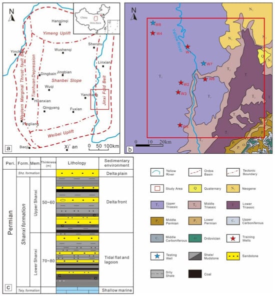 The world is currently in the transitional phase from traditional energy to renewable energy, and the unconventional oil and gas industry, including natural gas hydrates, deep coalbed methane, shale gas, and tight oil, still plays an irreplaceable role [1,2,3]. In China, unconventional oil and gas exploration has gradually shifted towards developing deep shale gas and deep coalbed methane [4,5,6]. A detailed understanding of deep shale gas and coalbed methane reservoir characteristics and geological conditions is a prerequisite for accurately exploring oil and gas reservoirs [7]. The Ordos Basin is a highly significant oil and gas basin in China, particularly in the eastern part, which contains abundant shale gas resources from the Upper Paleozoic strata. The deep shale gas reservoirs of the Permian Shanxi Formation, with burial depths greater than 2000 m, feature thin, high-quality shale layers, rapid lithological changes, and highly complex stress states, making it challenging to predict reservoir characteristics with advanced technologies. Lithofacies is a comprehensive assemblage comprising lithology, sedimentary structures, mineral composition, and paleontological features, which collectively provide valuable geological information. The main advantages of lithofacies identification include predicting reservoir properties, identifying geological conditions, optimizing exploit plans, and avoiding risks. Therefore, accurately predicting shale reservoir lithofacies is crucial for determining the sweet spots for oil and gas development [8,9]. Traditional reservoir analysis relies on core sampling during drilling, where geologists subject rock samples to subjective analysis using microscopes, chemical analysis, and other tools, classifying lithofacies based on mineral compositions and proportions obtained from laboratory tests. This method is labor-intensive, requiring extensive core sampling, long laboratory analysis periods, and specialized petrologists’ expertise for judgment. Subsequently, geologists utilized well-logging data and traditional intersection plots for lithofacies identification [10]. However, the accuracy of this prediction method is too low (about 70%) [11] to achieve the precision required for identifying the sweet spot zones in oil and gas exploration.