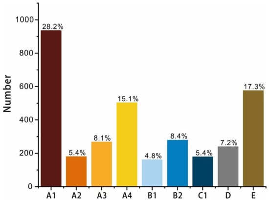 The lithofacies of the Shanxi Formation are highly unevenly distributed in the study area (Figure 4). For instance, the massive bedding argillaceous shale (A1) constitutes the largest proportion, accounting for up to 28.2% of all lithofacies. The laminated bedding argillaceous shale (A2), massive bedding siliceous shale (B1), and massive bedding mixed shale (C1) account for 5.4%, 4.8%, and 5.4%, respectively. To eliminate prediction bias caused by data imbalance, the data were balanced using SMOTE (Synthetic Minority Over-sampling Technique) [45,46]. SMOTE randomly selects a minority class sample and then identifies the k nearest neighbors (typically k = 5). For each synthetic sample to be generated, a point is randomly chosen along the line segment connecting the minority sample and its neighbor, and a new sample is created. This process is repeated until the dataset is balanced. The changes in lithofacies distribution before and after applying SMOTE are shown in Table 2.