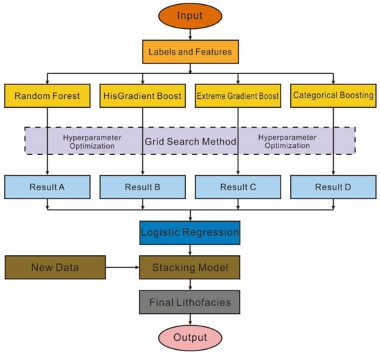 This study assembles four base classifiers into an advanced stacking model to perform detailed lithofacies prediction for shale reservoirs in gas fields deposited in the marine–continental transition zone. Core data and corresponding well-logging records were obtained from six wells (Well-W1, -W2, -W3, -W4, -W5, and -W6) and two blind wells (Well-W7 and -W8) in the Permian Shanxi Formation on the eastern margin of the Ordos Basin. In the initial phase, well-log data were processed and matched with lithofacies data to construct the dataset, which was then divided into training and testing sets. On the dataset, we compared the performance of the stacking model with five commonly used models (RF, HGB, XGB, Cat, and FCNN), evaluating prediction accuracy using metrics such as Accuracy, Recall, Precision, and F1 Score, as well as visual tools like confusion matrices and ROC curves. Ablation experiments were conducted to validate the contribution and effectiveness of each base model to the overall ensemble model. Our study demonstrates that the stacking model can reliably identify different shale lithofacies in heterogeneous layers, providing significant assistance for reservoir evaluation and sweet spot prediction in oil and gas exploration. The workflow chart used to accomplish this study is presented in Figure 1.