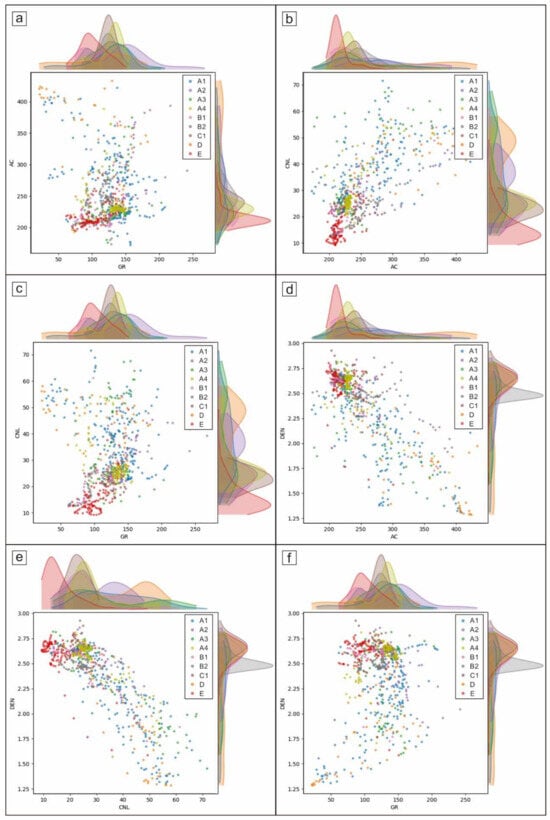 To analyze the relationship between the response characteristics of different lithofacies well-logging curves, we conducted a cross-plot analysis on 8371 samples from the study area (Figure 6). Additionally, the probability density curves for different lithofacies were displayed above and to the right of the cross plot. The cross-plot and probability density curves help reflect the sensitivity of well-logging curves to different lithologies. The smaller the overlap in the distribution range of the cross plot for different lithofacies, the better the effect of using these two curves to distinguish the lithofacies. Similarly, the greater the separation between the peaks of the probability density curve, the better the ability to distinguish lithofacies using this curve. The figure shows that the GR curve measures the formation’s natural radioactivity. Generally, mudstone or shale is more enriched with rare earth elements, so the radioactivity is higher. The GR curve has three peaks on the probability density plot, which can distinguish A2, B2, and E lithofacies. The AC curve reflects the propagation velocity of sound waves in the formation. It shows three peaks on the probability density plot, effectively distinguishing A4, C1, and E lithofacies. The CNL curve uses the interaction between neutrons and atoms in the formation, particularly the slowing effect of hydrogen atoms on neutrons, to assess changes in formation porosity. The CNL curve performs well in classification, clearly dividing into four peaks on the probability density plot, effectively distinguishing A, C1, D, and E lithofacies. The DEN curve reflects the bulk density of the formation based on gamma-ray scattering and absorption. It is divided into two peaks on the probability density curve, distinguishing B2 from other lithofacies. The RT curve measures the resistivity of the formation, which is significantly influenced by the enrichment of organic matter. It is divided into two peaks on the probability density curve, distinguishing B2 from other lithofacies. Therefore, conventional cross-plots can only distinguish sandstone from shale but cannot further distinguish the shale structure and mineral composition.