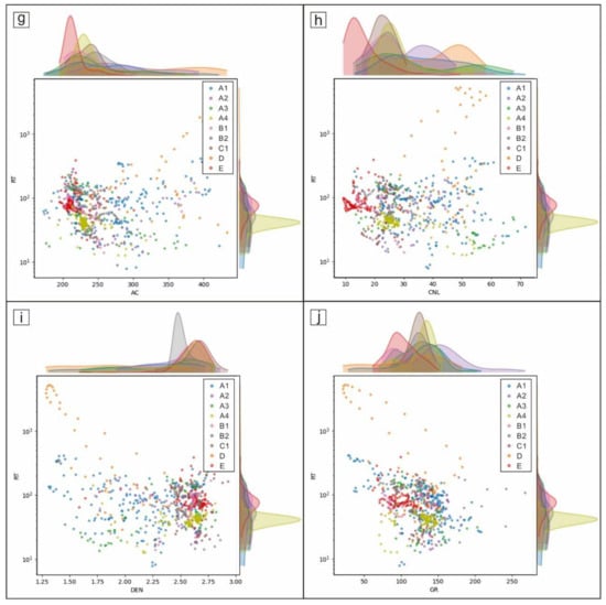 The cross-plot figures showing the correlations among five well logs, whereby nine distinct lithofacies are visually distinguished by using various colors ((a), AC-GR; (b), CNL-AC; (c), CNL-GR; (d), DEN-AC; (e), DEN-CNL; (f), DEN-GR; (g), RT-AC; (h), RT-CNL; (i) RT-DEN; (j), RT-GR).