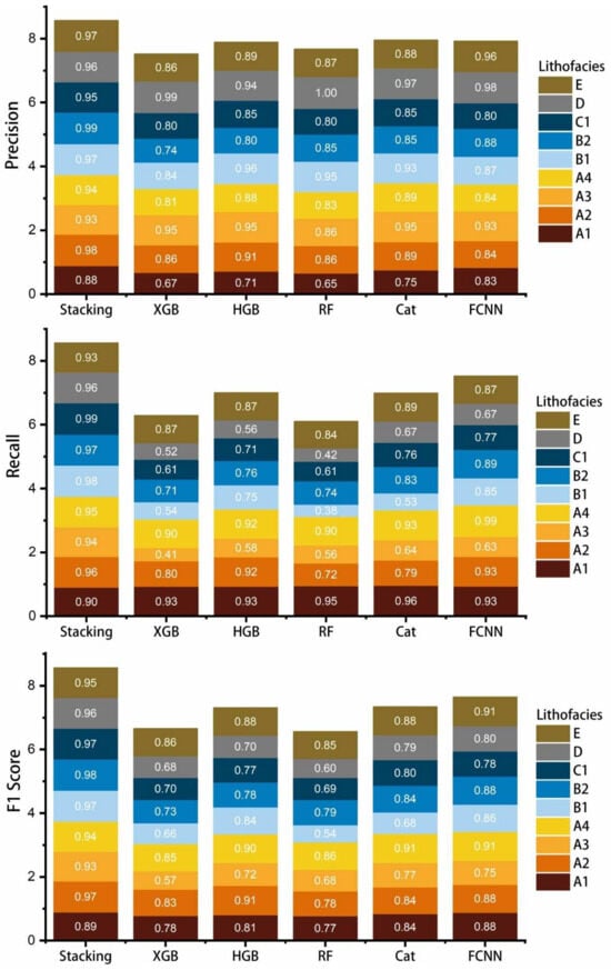 Figure 7 used a stacked bar chart to visualize the recognition performance of different models for various lithofacies categories. The results show that all models performed well for the sandstone (E), with the Recall, Precision, and F1 Score close to 0.85. The mineral composition of sandstone is significantly different from that of other lithofacies, and sandstone has high porosity. The probability density plot also clearly separates E and other lithofacies (Figure 6). For the recognition of coal (D), the Precision of all models is close to 0.9, but the Recall of XGB, HGB, RF, Cat, and FCNN is poor, close to 0.6, indicating that a few D lithofacies were misclassified. For the recognition of shale lithofacies, unexpectedly, all models performed well in identifying massive bedding argillaceous shale (A1) and flaser bedding argillaceous shale (A4), with the Recall, Precision, and F1 score all close to 0.8. The result may be because, during the transition of clayey shale structures from horizontal lamination to flattened structures, the content of felsic minerals significantly increases, along with its porosity, resulting in a better logging response. XGB, HGB, RF, Cat, and FCNN have considerable misclassifications in predicting lenticular bedding argillaceous shale (A3). Similarly, XGB, RF, and Cat have lower recognition performance for massive bedding siliceous shale (B1) and massive bedding mixed shale (C1). It shows that the mineral compositions of these lithofacies are quite similar, so their logging responses do not differ significantly. In the probability density plot, the peaks of these lithofacies overlap (Figure 6). On the other hand, the stacking model performs excellently in recognizing all lithofacies, with the Recall, Precision, and F1 Score exceeding 0.9 for each lithofacies, with some lithofacies reaching up to 0.99.