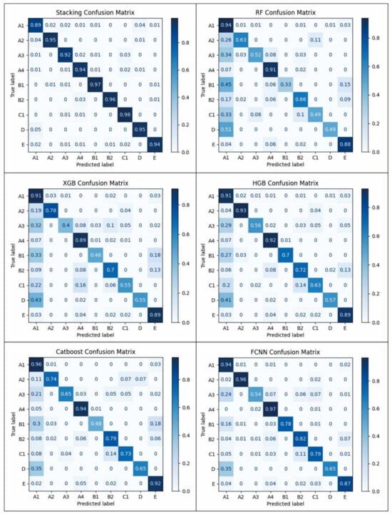 The confusion matrix is commonly used to visualize the model’s overall accuracy, and the normalized confusion matrix results for each lithofacies are shown in Figure 8. All models exhibit high accuracy in predicting A1, A4, and E lithofacies, with recognition rates close to 90%, consistent with the results in Figure 5. For shale lithofacies classification, the RF, XGB, and Cat models perform moderately, with RF and XGB performing the worst, as multiple lithofacies have recognition rates below 0.5. The HGB and FCNN models perform better, with recognition rates close to 0.8 for A1, A2, A4, B1, and B2 lithofacies, but the recognition rates for A3 and D lithofacies are lower, around 0.6. Among all models, the stacking model still performs the best, with recognition rates for nearly all lithofacies reaching 0.9, although 13% of other lithofacies are still misclassified as A1 during A1 recognition. Overall, most models are unable to recognize laminated bedding argillaceous shale (A2) and lenticular bedding argillaceous shale (A3), and they also struggle to recognize massive bedding siliceous shale (B1) and massive bedding mixed shale (C1). The main reasons are as follows: first, the distinction between laminated bedding shale and lenticular bedding shale is unclear, and the two often exist in a transitional state. Second, although the felsic mineral content of siliceous shale is more than 50%, it is not much different from mixed shale (Figure 3).