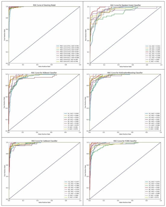 The ROC curve (receiver operating characteristic curve) is also commonly used to evaluate the predictive performance of models, with the horizontal and vertical axes representing the false positive rate (FPR) and true positive rate (TPR), respectively. The AUC (Area Under Curve) is defined as the area under the ROC curve, with values typically ranging from 0.5 to 1, where a larger AUC indicates better classifier performance. The ROC curves for different classification models are shown in Figure 9. All models for sandstone (E) show high predictive classification performance, with AUC values greater than 0.95. For shale lithofacies, the ROC curve characteristics of different models vary. The ROC curves for each lithofacies from the optimal model, stacking, nearly overlap with the top-left corner of the coordinate system, with AUC values of 0.992, 0.998, 0.997, 0.997, 1.000, 1.000, 0.998, 0.997, and 0.996 for A1, A2, A3, A4, B1, B2, C1, D, and E, respectively, all greater than 0.99, indicating excellent recognition performance.