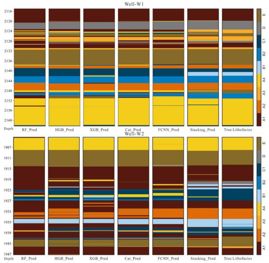 Comparison of predicted lithofacies by RF, HGB, XGB, Cat, FCNN, and stacking models in Well-W1 and Well-W2.