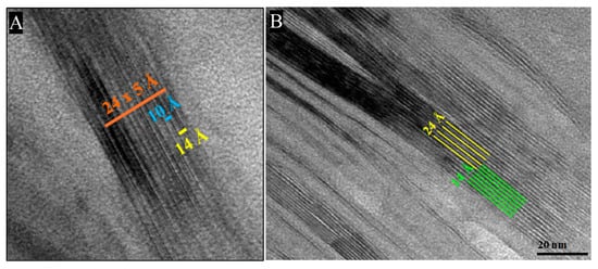 The TEM images (Figure 6A,B) show that the chloritic areas consist of stacked multiple-layer packets, each ranging from 100 to 500 Å in thickness. The term “packet”, as used here, refers to a sequence of coherent layers with identical crystallographic orientation. These packets are slightly disoriented but show sub-parallel orientation (Figure 6A). More in detail (Figure 6B), the packets include a variable number of layers, generally less than 10, showing differences in contrast and, sometimes, spacing.