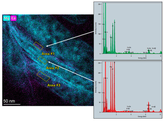 Chemical maps obtained in STEM-HAADF mode (Figure 8) allow recognising differences in composition in a parallel arrangement, which, according to the corresponding EDS spectra, indicate 1) nearly pure chlorite areas (area 2, red spectrum) vs. significant enrichment in interlayer cations (Ca and K) and a reduction in Mg and Fe (area 1, green spectrum).