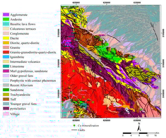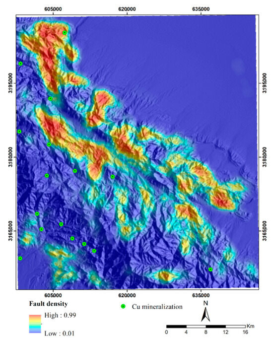 Various mineral deposits are correlated with specific geological structures, particularly faults and fractures [76]. Previous MPM studies have demonstrated the crucial role of faults in identifying prospective areas for intrusive-related deposits, such as porphyry copper mineralization [57,77]. These faults, along with fractured and crushed zones, act as suitable conduits for the movement of hydrothermal and ore-bearing magmatic fluids, promoting the development of alteration zones linked to mineralization. As a result, areas with a high fault density are considered favorable for porphyry copper exploration.