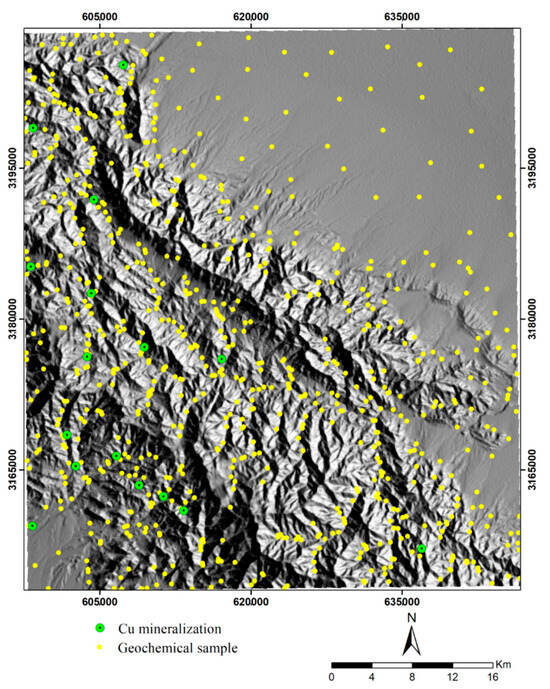 In addition to satellite data, this study utilized 745 stream sediment samples collected by the Geological and Mineral Exploration Survey of Iran to create a geochemical evidence layer. These samples were available for 20 elements (i.e., Zn, Pb, Ag, Cr, Ni, Bi, Sc, Cu, As, Sb, Cd, Co, Sn, Y, Ba, V, Sr, Hg, W, and Au). However, based on the conceptual model of porphyry copper deposits and previous studies [57,58], eight elements were used for a geochemical analysis. The locations of the stream sediment samples are illustrated in Figure 2.