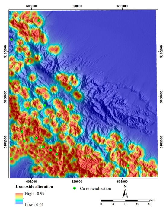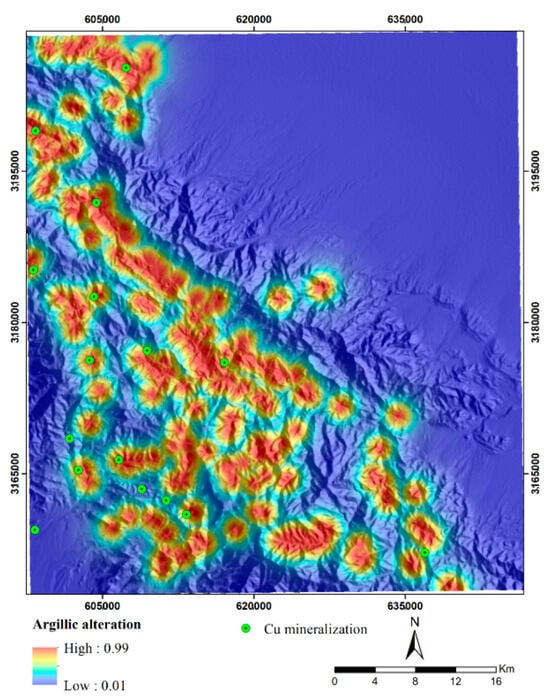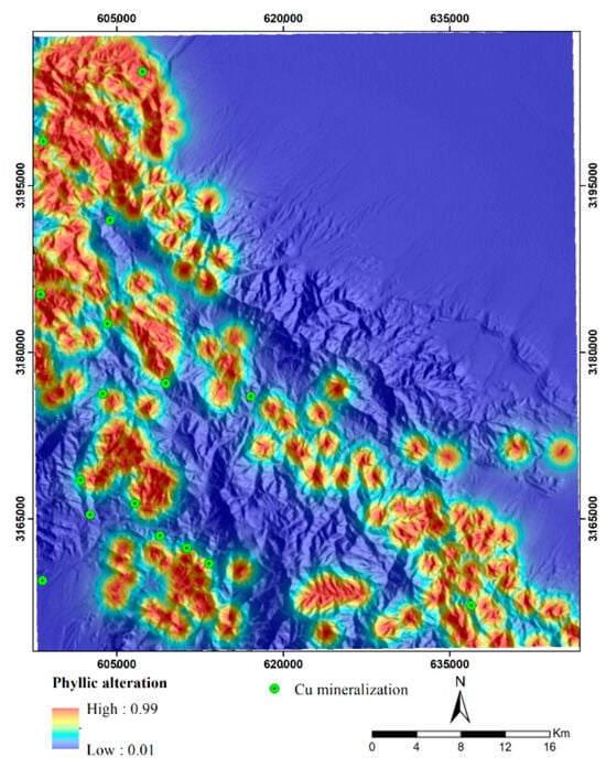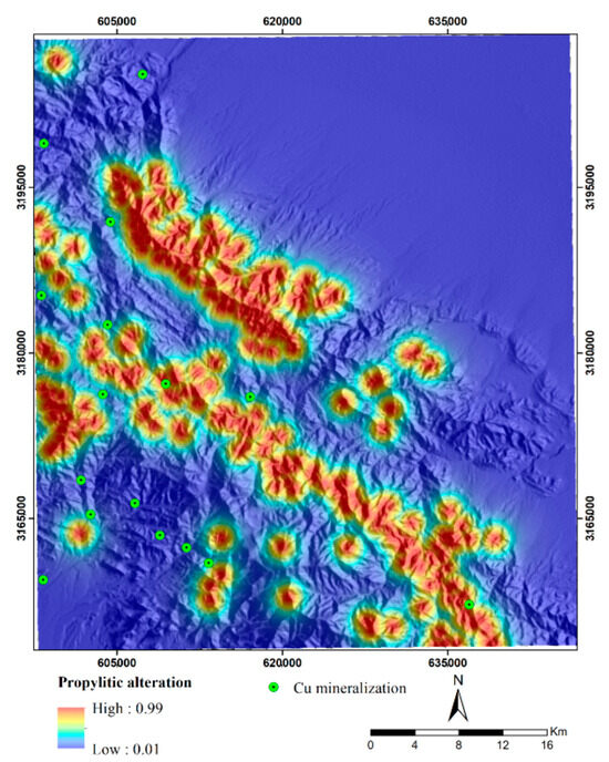 Hydrothermal fluids have an essential role in the formation of hydrothermal deposits, such as porphyry copper. The movement and migration of these fluids lead to significant changes in the chemical composition and mineralogy of the surrounding rocks related to mineralization. Hydrothermal alterations surrounding porphyry copper deposits typically exhibit specific patterns and often encompass a larger surface area compared to the mineralization. Therefore, identifying zones with hydrothermal alterations is a fundamental aspect of the exploration of porphyry copper deposits on a regional scale [71,72]. The spectral characteristics of indicator minerals within these zones facilitate their identification through satellite image processing. As a result, hydrothermal alteration data can be utilized to generate remote sensing evidence layers for the potential mineral modeling of porphyry copper deposits. In this study, hydrothermal alteration zones, including phyllic, argillic, propylitic, and iron oxide alterations, were identified through ASTER image processing using band ratios and spectral angle mapper techniques. Band ratios of 4/2, 5/6, 7/6, and 9/8 were used to map several alteration zones (i.e., iron oxide, argillic, phyllic, and propylitic) [71,72,73,74]. These ratios were selected based on the spectral features of the index minerals linked to each alteration and previous geological remote sensing studies. Also, the SAM method (along with the USGS library) was utilized to select endmember minerals (i.e., kaolinite, muscovite, and chlorite). The spectral absorption characteristics of these endmember minerals in the SWIR band of the ASTER image were applied as the spectral range to detect the alteration zones (i.e., argillic, phyllic, and propylitic). Subsequently, distance maps to these alteration zones were generated to create evidence layers. The values of these maps were then transformed to a 0-1 scale using the logistic function [75] defined in Equation (2) (Figure 4, Figure 5, Figure 6 and Figure 7). Notably, areas with higher values in these layers are predominantly associated with intrusive and igneous rocks, particularly within the faulted intrusive units located in the southern and southwestern parts of the region. This suggests that intrusive rocks and the intense activity of hydrothermal fluids in the Jebal Barez area have contributed to the development of extensive hydrothermal alteration zones.