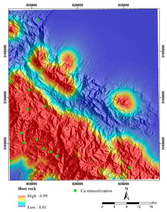 Porphyry copper deposits within the UDMZ show a strong spatial and genetic relationship with various intrusive rocks, including granite, granodiorite, monzonite, and quartz monzonite [70,78,79]. These rocks serve as proxy indicators of magmatic-related processes that contribute to the formation of ore-forming materials. The likelihood of porphyry copper deposit formation is higher in proximity to these rocks. Therefore, regions near intrusive rocks are considered to have higher exploration potential than more distant regions [70]. The majority of porphyry copper deposits, particularly the classic mineralization types found in the UDMZ, such as Sarcheshmeh and Sungun, exhibit a close association with intrusive rocks. This correlation has been confirmed through geological studies and various MPM investigations [78,80]. Thus, this study generated a distance map from intrusive rocks as a key evidence layer for modeling porphyry copper mineral potentials. The Euclidean distance from intrusive rocks was calculated to generate this layer, and its values were transformed into fuzzy space using a logistic function (Equation (2)). As demonstrated in Figure 9, a significant number of known mineral deposits in the Jebal Barez region exhibit a strong spatial relationship with high values of this geological layer. Therefore, this layer is considered one of the most crucial layers in the prospectivity modeling of porphyry copper deposits.