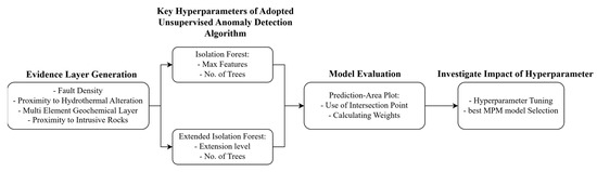 In MPM studies, evidence layers are created based on the conceptual model of the sought mineralization and known mineral deposits in the study area. This leads to high values in each evidence layer typically having a strong spatial correlation with known deposits. Therefore, in exploratory datasets, other samples with high values can be associated with the target mineralization and identified as prospective areas [13,17]. As a result, unsupervised machine learning algorithms, such as the IF, which identifies samples with high (anomalous) values, can be employed to generate mineral potential maps.