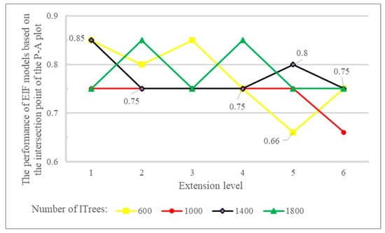 In total, 28 distinct models were generated using the IF algorithm, and each was evaluated based on the P-A plot. First, the 28 generated models were classified using the “natural break” method, and P-A plots were plotted using the thresholds derived from this method. Subsequently, the weight of each model was computed, which uses the intersection point of the prediction rate and curves. Figure 11 illustrates the impact of different values for the maximum features and number of ITrees on the weight obtained for each IF model. As can be observed, increasing the maximum features generally improves the performance of the IF model, regardless of the number of ITrees used. For lower values of the maximum features (1 and 2), the models exhibited lower performance, with scores ranging between 0.49 and 0.66. This pattern contrasts with higher values of maximum features (4 to 7), where the performance significantly improved and reached values between 0.71 and 0.85. For instance, models built with 1400 ITrees show a noticeable improvement in performance as the maximum feature values increase. Specifically, as the maximum feature values increased, the model’s performance improved gradually, from 0.53 (maximum features set to 1) to 0.85 (maximum features set to 7). This indicates that the model’s ability to capture important patterns improves with higher values for the maximum features.