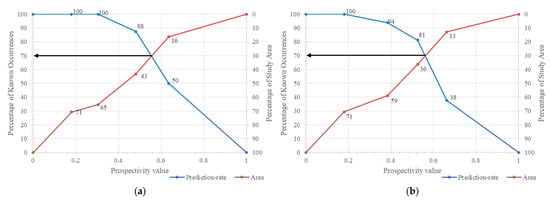Evaluating the degree of importance and the prediction rates associated with the generated prospectivity models is essential in the MPM tasks. In this regard, the prediction-area (P-A) plot [81,82] can be utilized. This plot is based on ground truth positive samples (known as mineral deposits) and is considered one of the most effective data-driven methods for the quantitative evaluation of prospectivity models. The accuracy of mineral potential models can be evaluated by analyzing the spatial relationship between the known mineral deposits and each of the generated model classes. This plot consists of two curves [82,83,84], and their intersection point indicates the prediction rate and accuracy of the prospectivity model. If the intersection point of a specific prospectivity model indicates a higher prediction rate (left axis) compared to the plots of other models, it implies that the former model has successfully identified a greater number of known mineral deposits within a smaller area (right axis). The normalized density of the MPM model, as a numerical assessment index, is derived based on the intersection of the prediction rate and occupied area curves. This index is obtained by calculating the ratio of the prediction rate to the occupied area at the intersection point (Equation (5)). Finally, the weight of each prospectivity model is determined based on Equation (6).