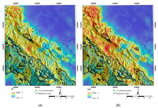 (a) Prospectivity map of copper porphyry produced by the IF algorithm with 7 and 1400 for feature hyperparameters and number of ITrees, respectively, and (b) prospectivity model produced by optimal hyperparameters of the EIF method.