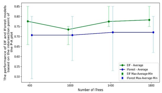 In Figure 11 and Figure 12, we investigate the impact of key hyperparameters on the performance of the IF and EIF models. As illustrated in Figure 15, our comparative analysis specifically focuses on the average results across different numbers of ITrees and assesses the impact of this hyperparameter for both algorithms. The results indicate that the average performance remains relatively stable as the number of ITrees increases. This pattern is consistent for both the IF and EIF models and suggests that the average performance remains stable regardless of the number of ITrees when averaged over multiple runs with different values for the other hyperparameter (i.e., max feature for IF and extension level for EIF). This stability indicates that increasing the number of ITrees may not contribute substantially to enhancing the models’ anomaly detection capabilities. These patterns also can be observed in Figure 11 and Figure 12, as the models with a higher number of ITrees do not necessarily have higher performance. This indicates that both models reach a point where adding more trees does not contribute to better accuracy, particularly when considering averaged results.